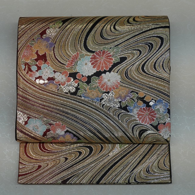 こちらの西陣織袋帯は、大胆な流水の中に浮かぶ春秋の小花があしらわれたデザインが特徴です。 金糸と赤と黒のコントラストが鮮やかに映え、華やかさを引き立てる魅力的な帯となっています。 流れるような流水のパターンが動きを感じさせ躍動感を演出しています。 長さは436㎝で、振袖のほかに訪問着、付け下げ、色無地、江戸小紋などの着物と組み合わせることで、存在感のあるコーディネートが実現します。 外出時の使用にも十分対応できますので、実際にお出かけの際にご利用いただけます。 もちろん成人の日や前撮りの振袖着付けの練習にもお役立てください。 お仕立て上がりのため、届いたその日からすぐにお使いいただけるのも嬉しいポイントです。 この袋帯でコーディネートを楽しみながら、着付けの技術を磨いてください! なお、お使いのモニターや環境等により実際のお色目が異なる場合があります。