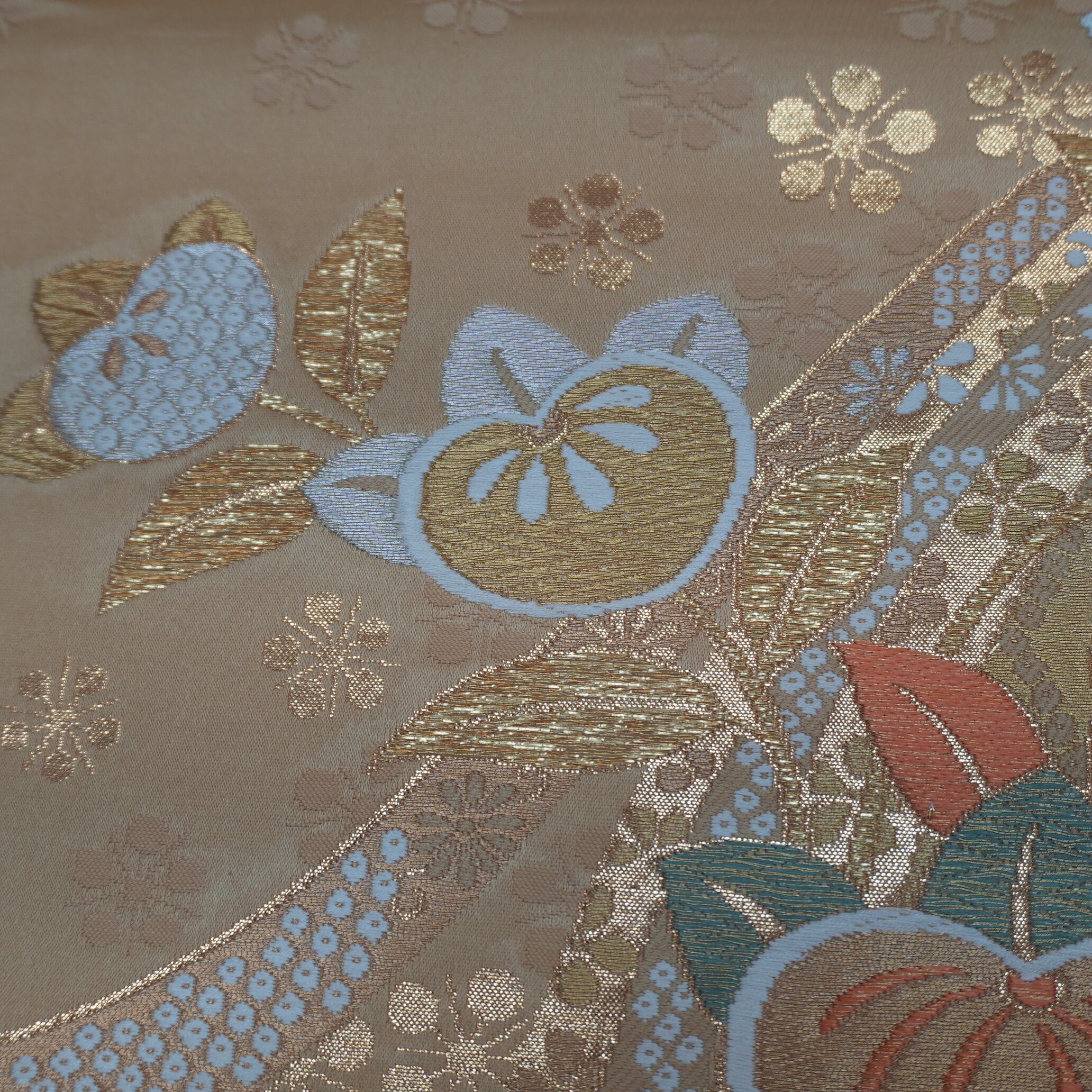 こちらの美しい西陣織袋帯は、落ち着いた金地に橘、熨斗の華やかなデザインが特徴です。着物と合わせることでより一層華やかさが増します。