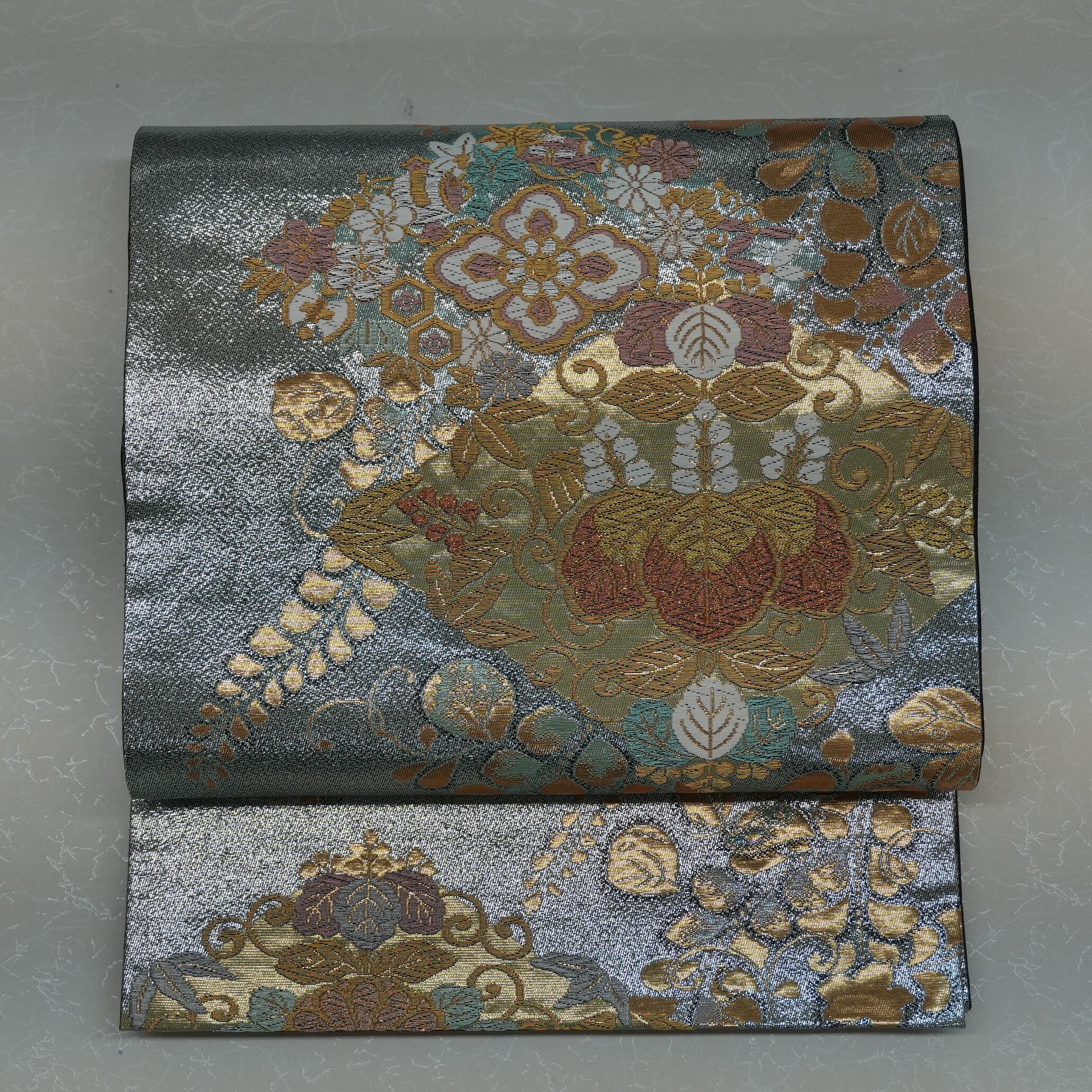 こちらの西陣織正絹袋帯は、落ち着いた黒っぽい銀箔地の上に辻が花や桐入り菱が大胆に配置された格調ある帯です。辻が花は絞りを施したように見えるよう立体感を織で表現しています。また糸の太細を巧みに使い分け奥行きある表現が魅力的な帯となっています。