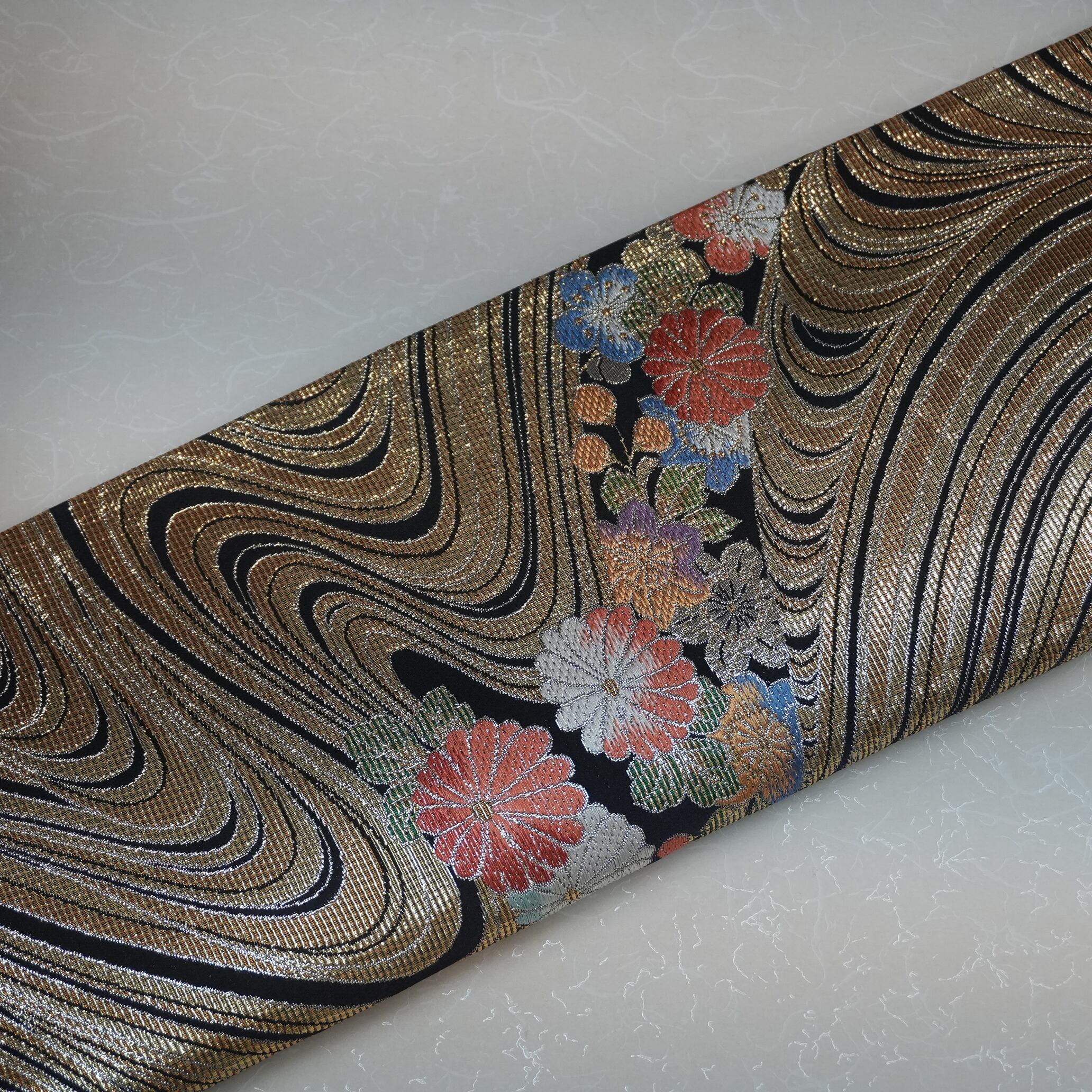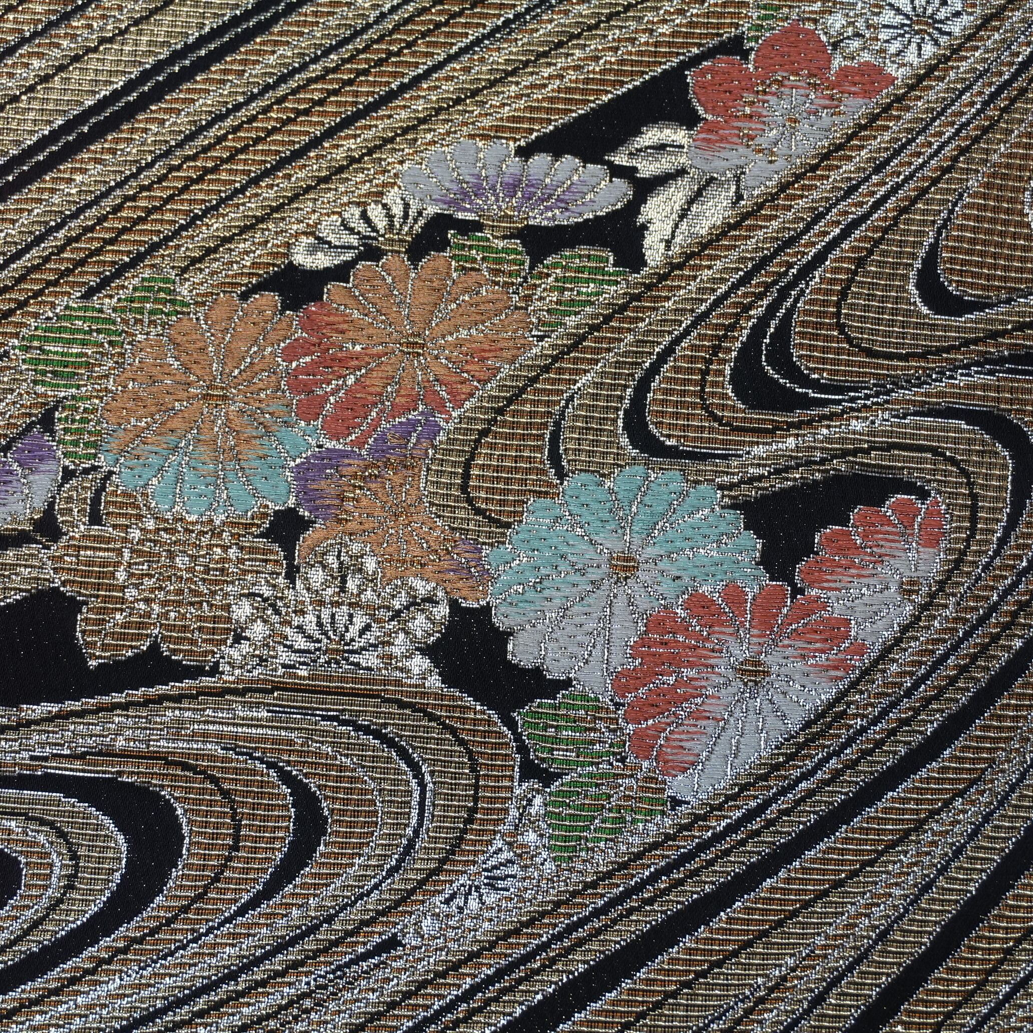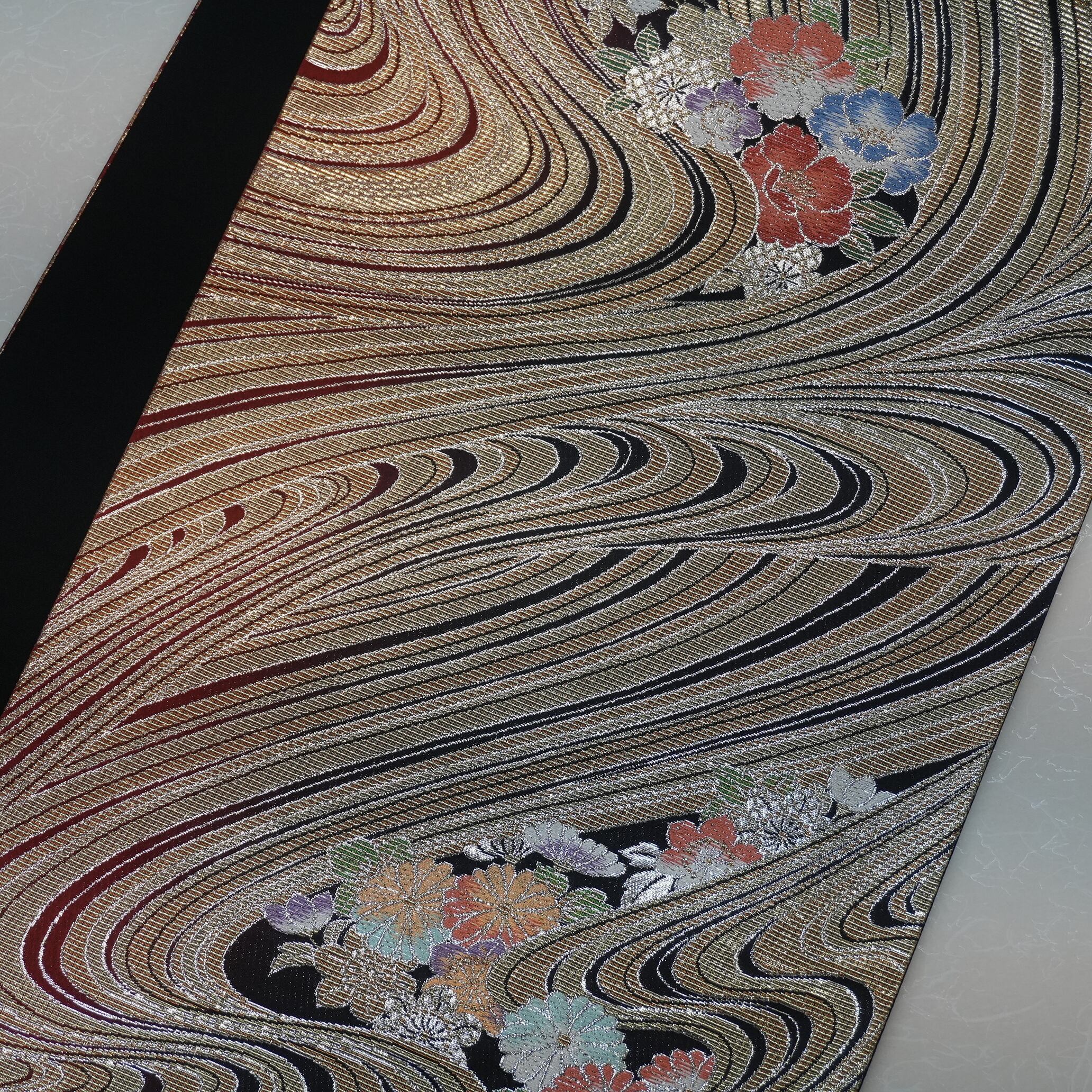 こちらの西陣織袋帯は、大胆な流水の中に浮かぶ春秋の小花があしらわれたデザインが特徴です。