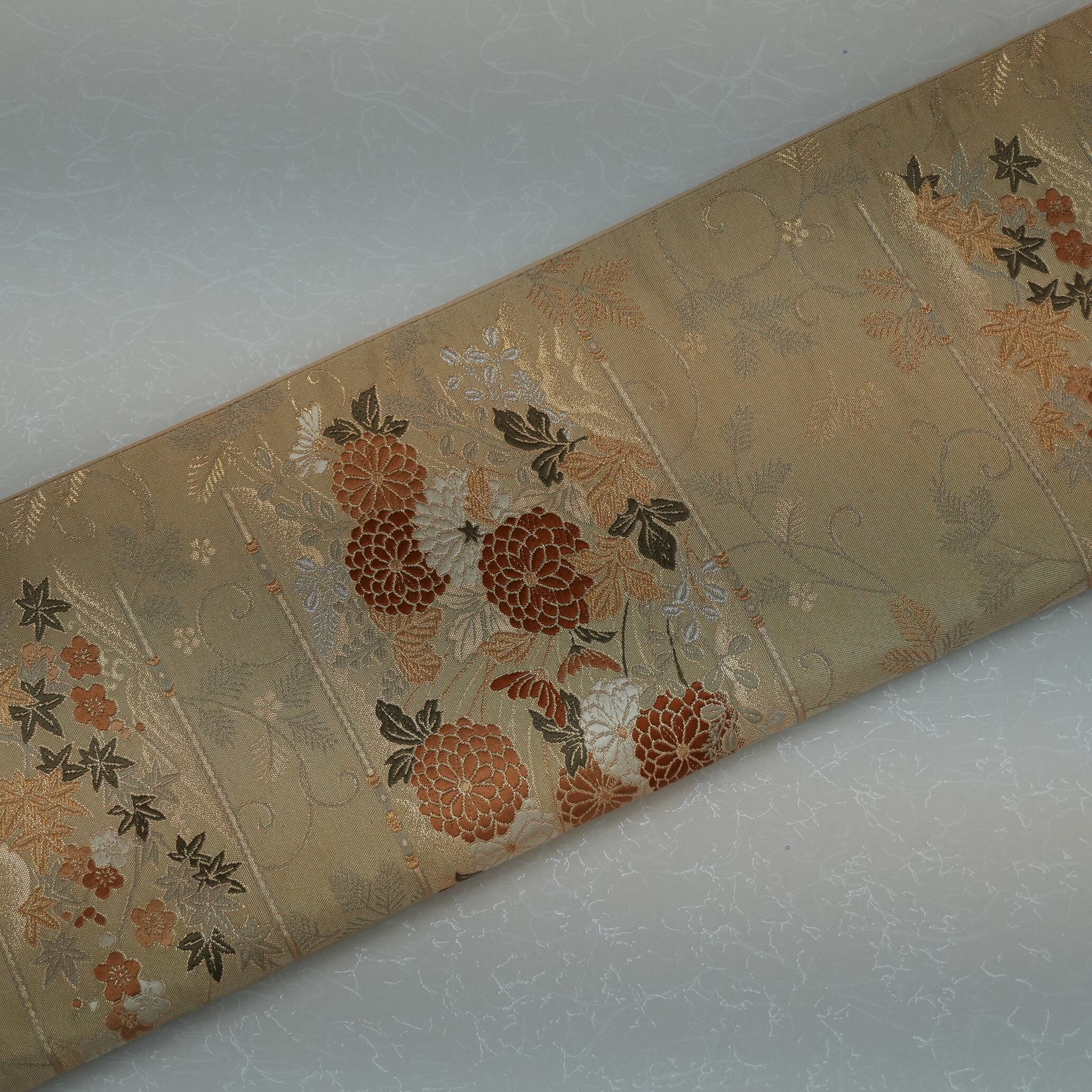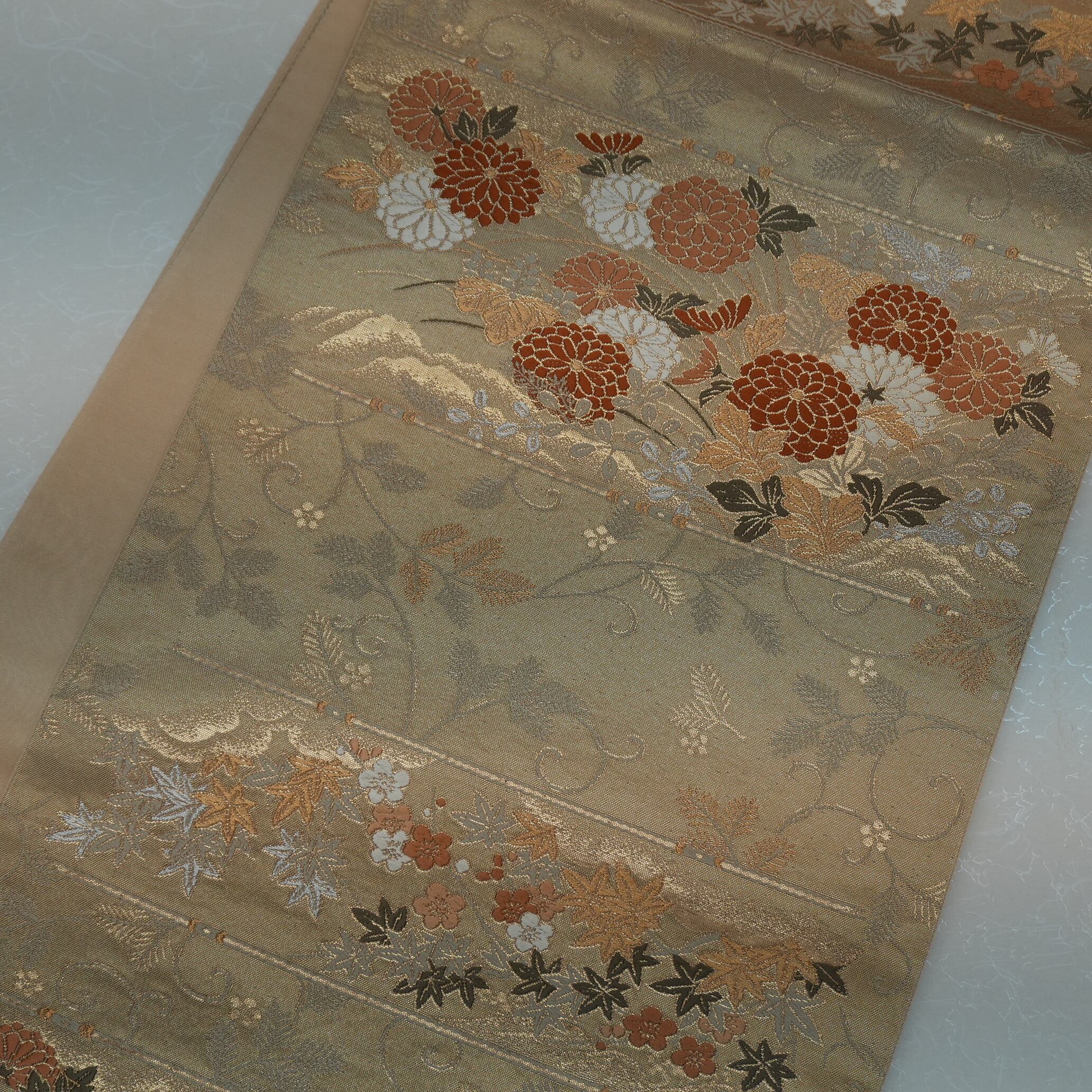 菊花の周囲には細かな織で梅、紅葉、萩の装飾が施されており、金地の上に金糸で表現することにより上品な華やかさを引き立てています。