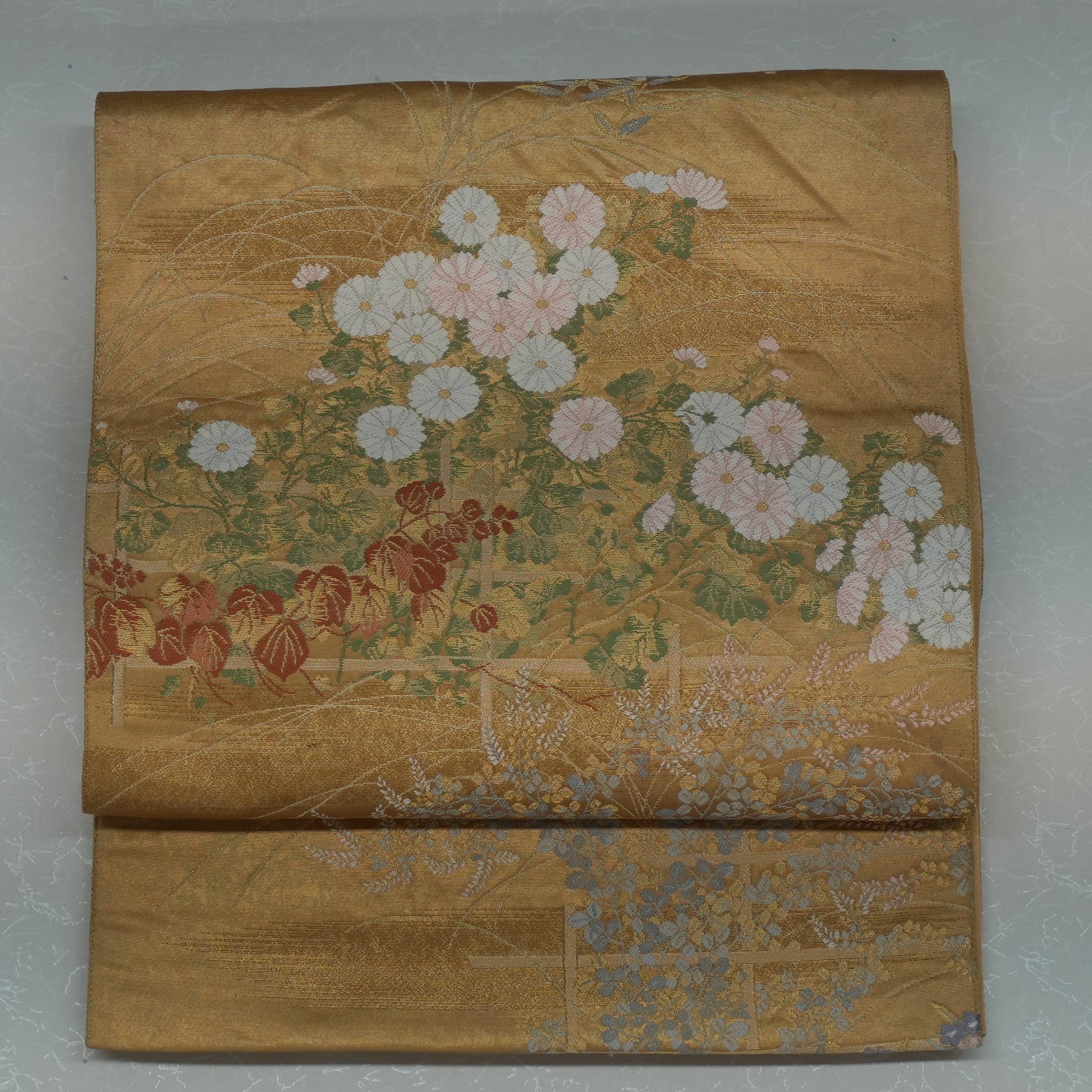 こちらの練習用お仕立て上がり袋帯は、白い小菊を中心に、桔梗、萩を華やかに配置し、金箔の地に浮かび上がるデザインが特徴です。