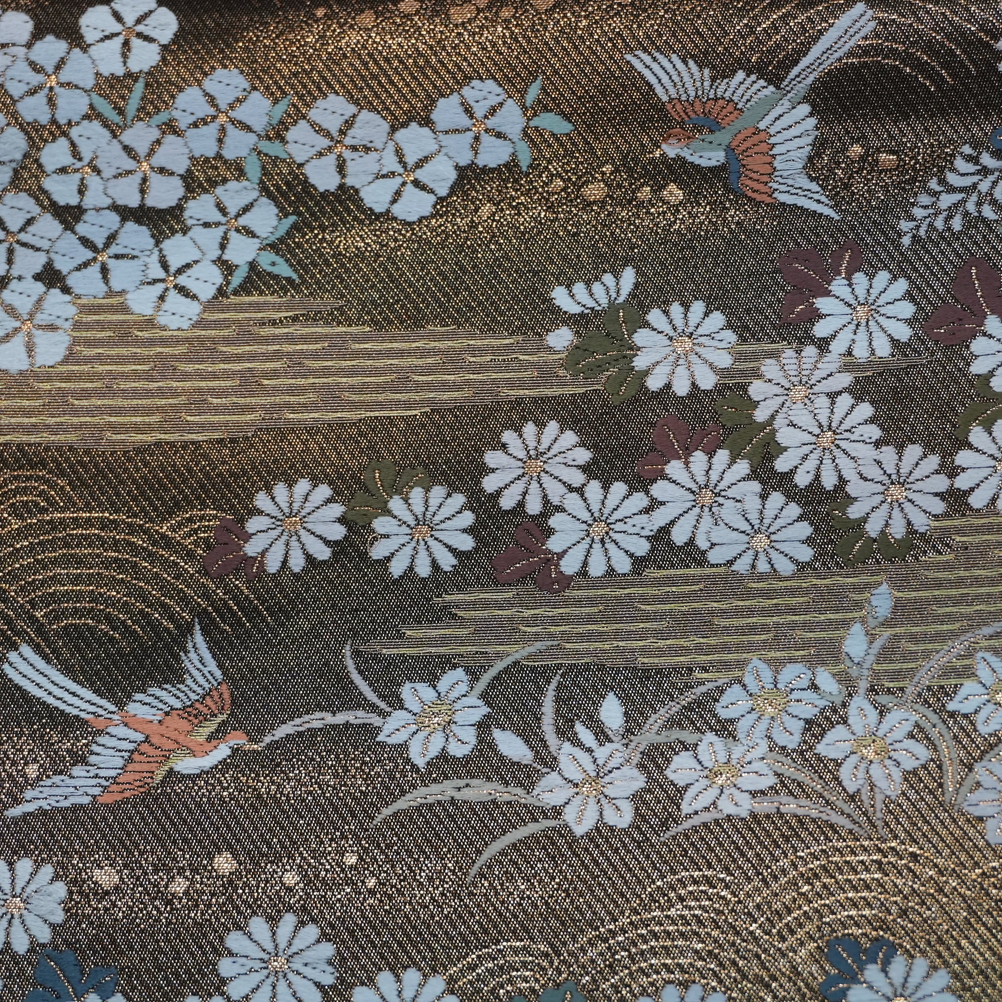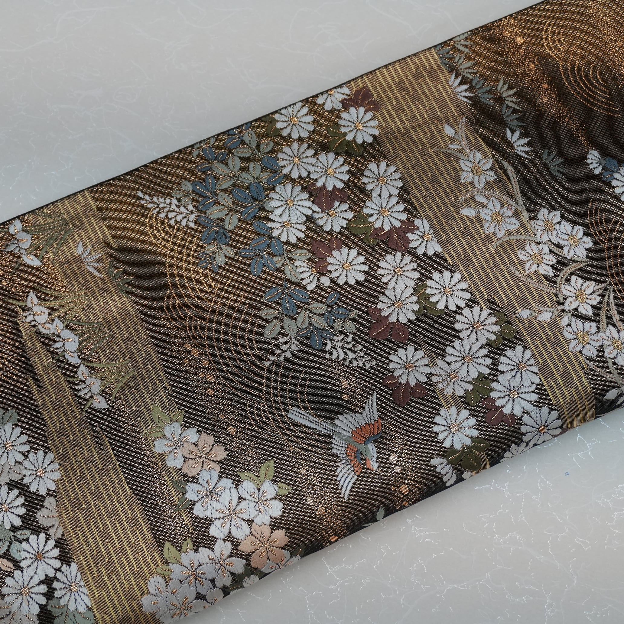 小花を取り巻くのは落ち着いた金糸で表現された霞や青海波。