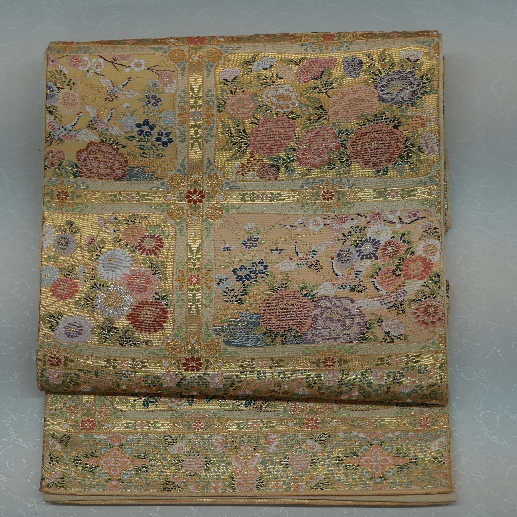 こちらの練習用お仕立て上がり袋帯は、日光東照宮社殿の国宝に指定されている廻廊を思わせる春秋草花と優雅に舞う鳥の華やかさが魅力です。