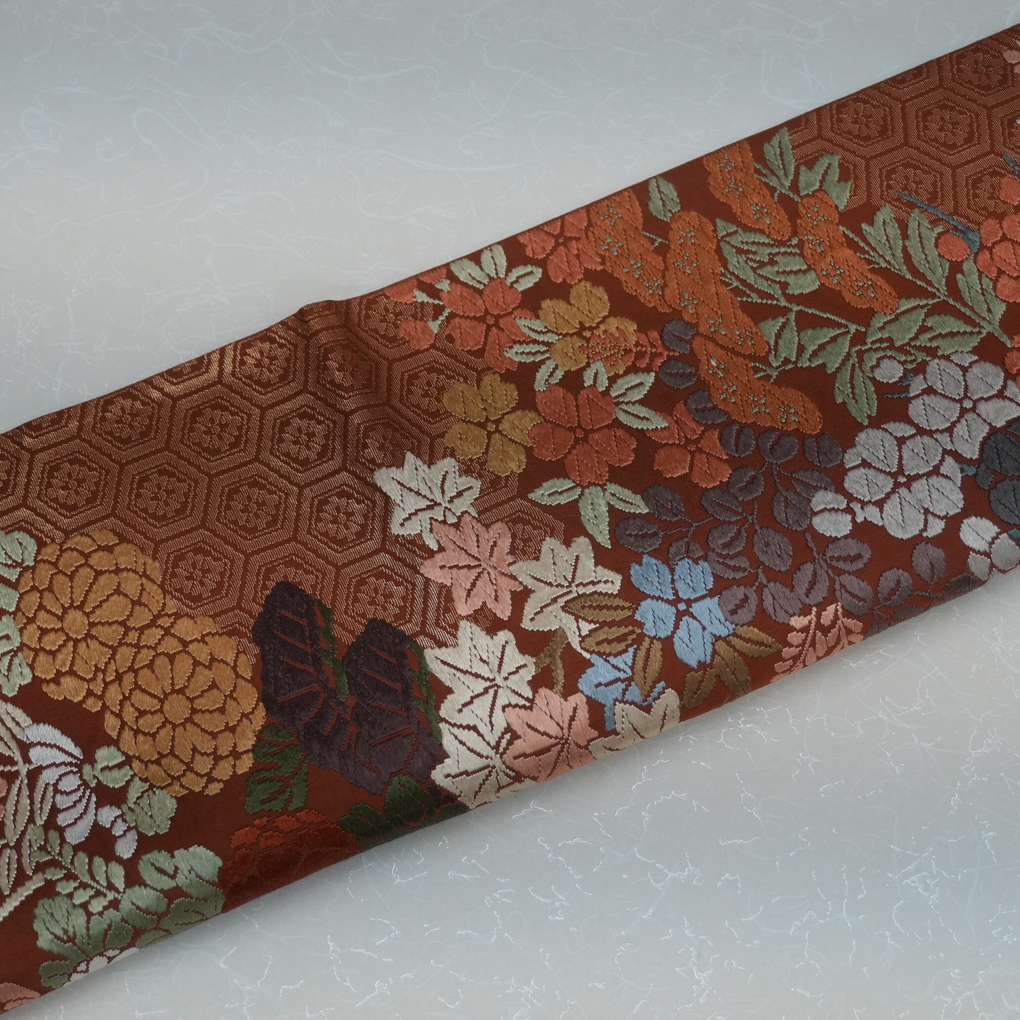 深い色目の朱地に織り出された亀甲の上に日本の古典色で表現された春秋草花が見事なまでに調和し、見る人を魅了する美しさを醸し出しています。深みのある色合いと上品な質感は、着物とのコーディネートを一層引き立てることでしょう。