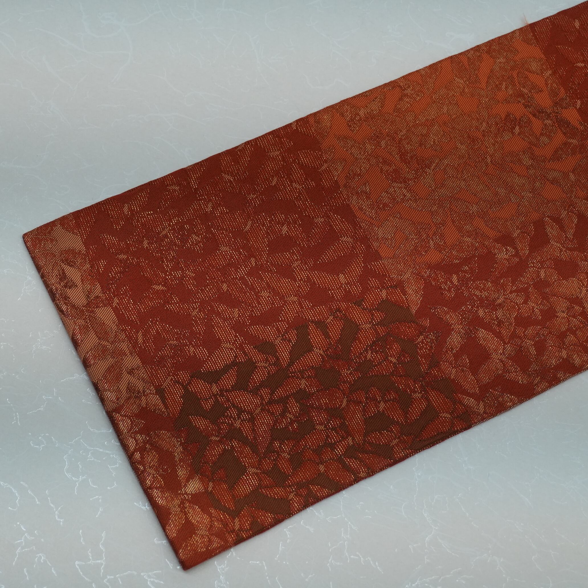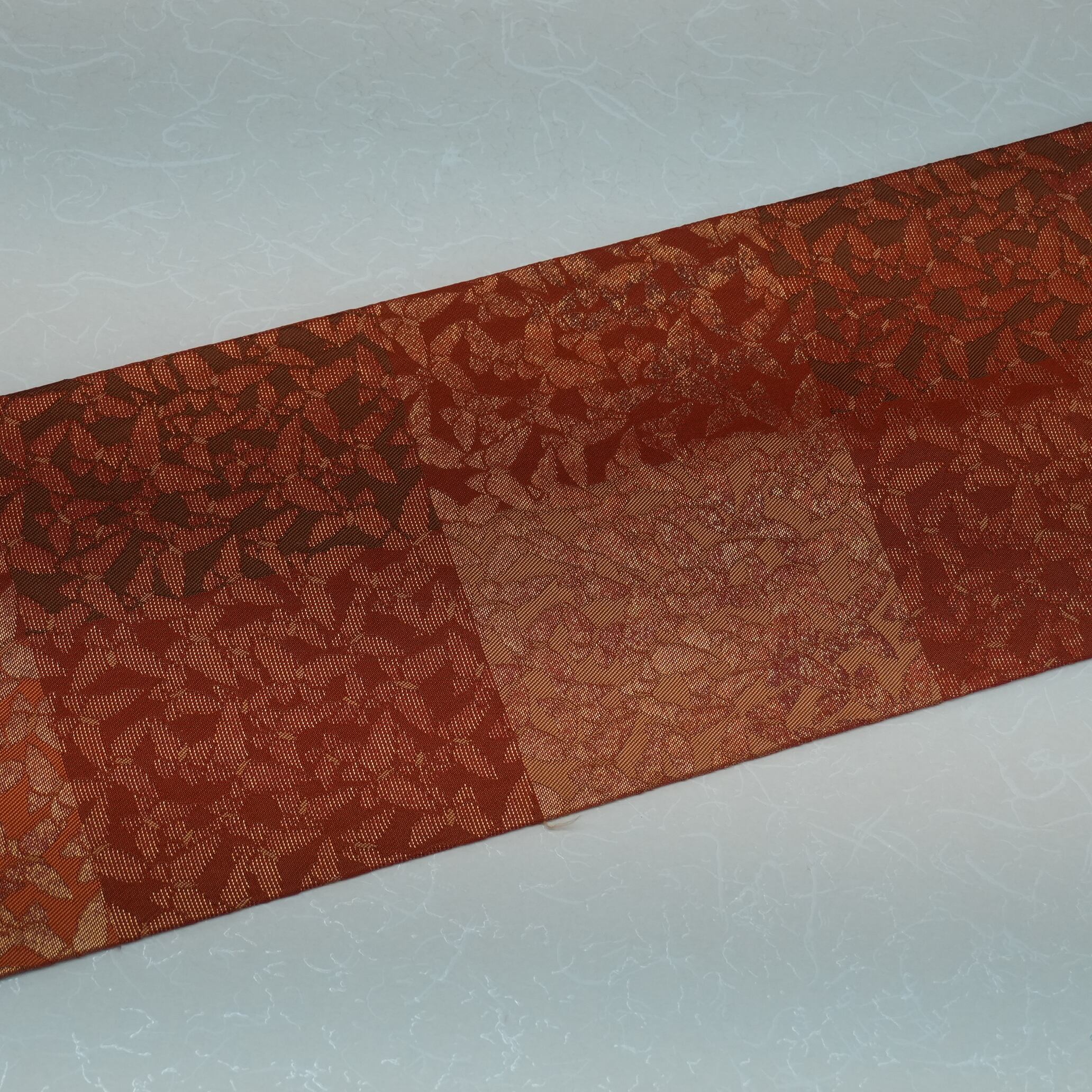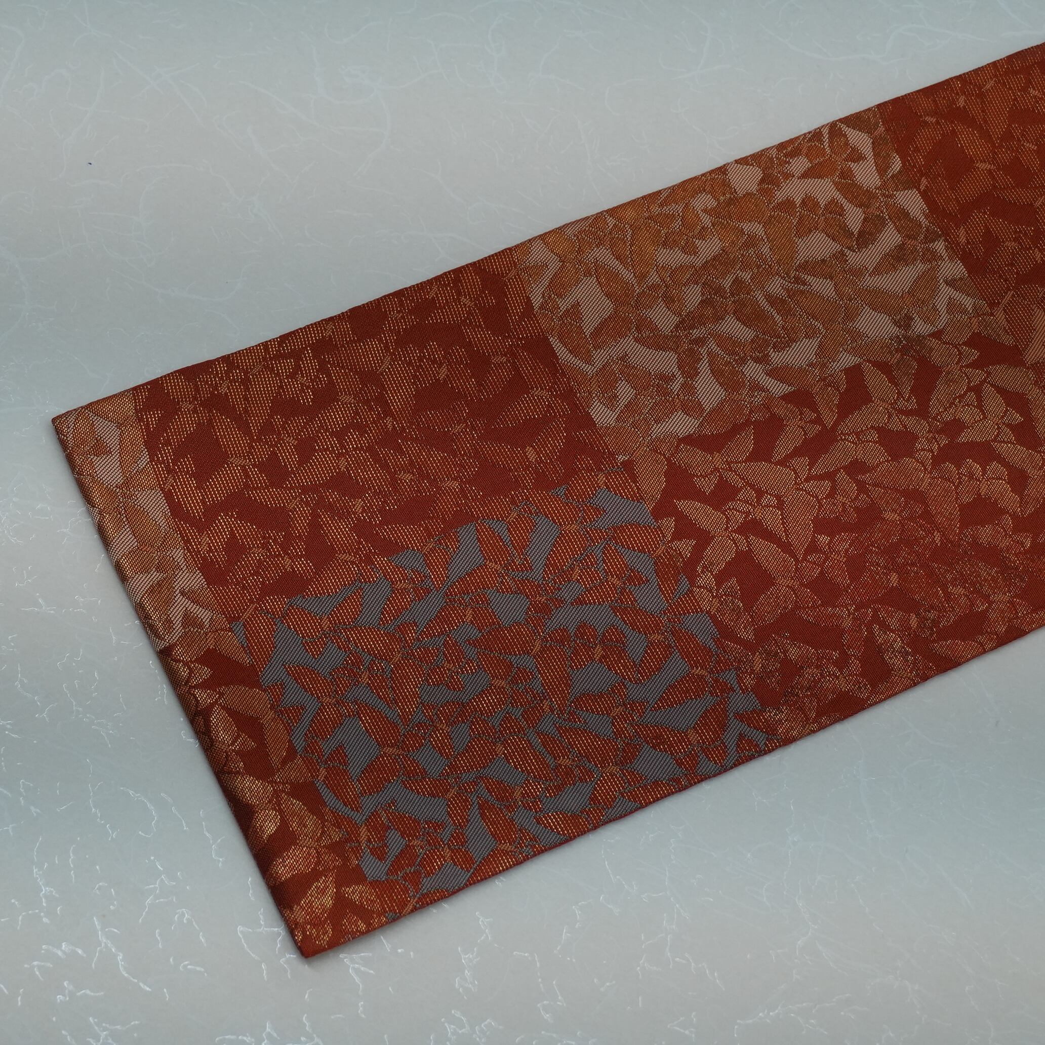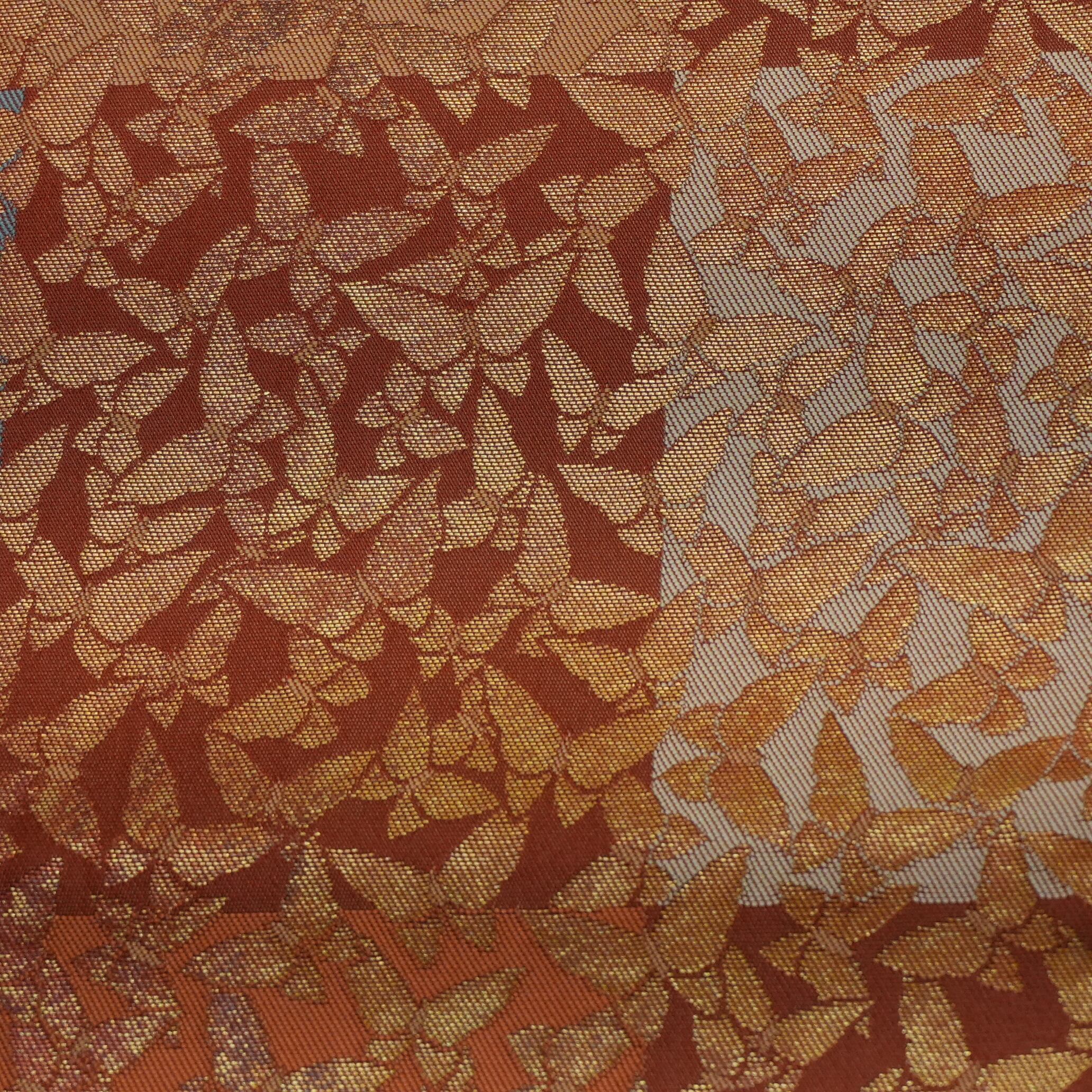 全長357cmのうち、お太鼓部分と前腹部分全てに紋様が織り出されている六通の九寸名古屋帯は、どの角度から見ても美しい仕上がりです。その美しさは、着物とのコーディネートを華やかに引き立て、着る人の魅力をより一層引き出すことでしょう。