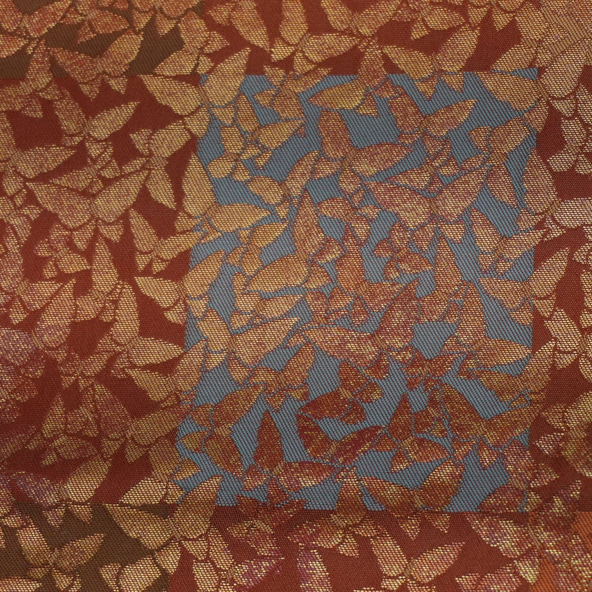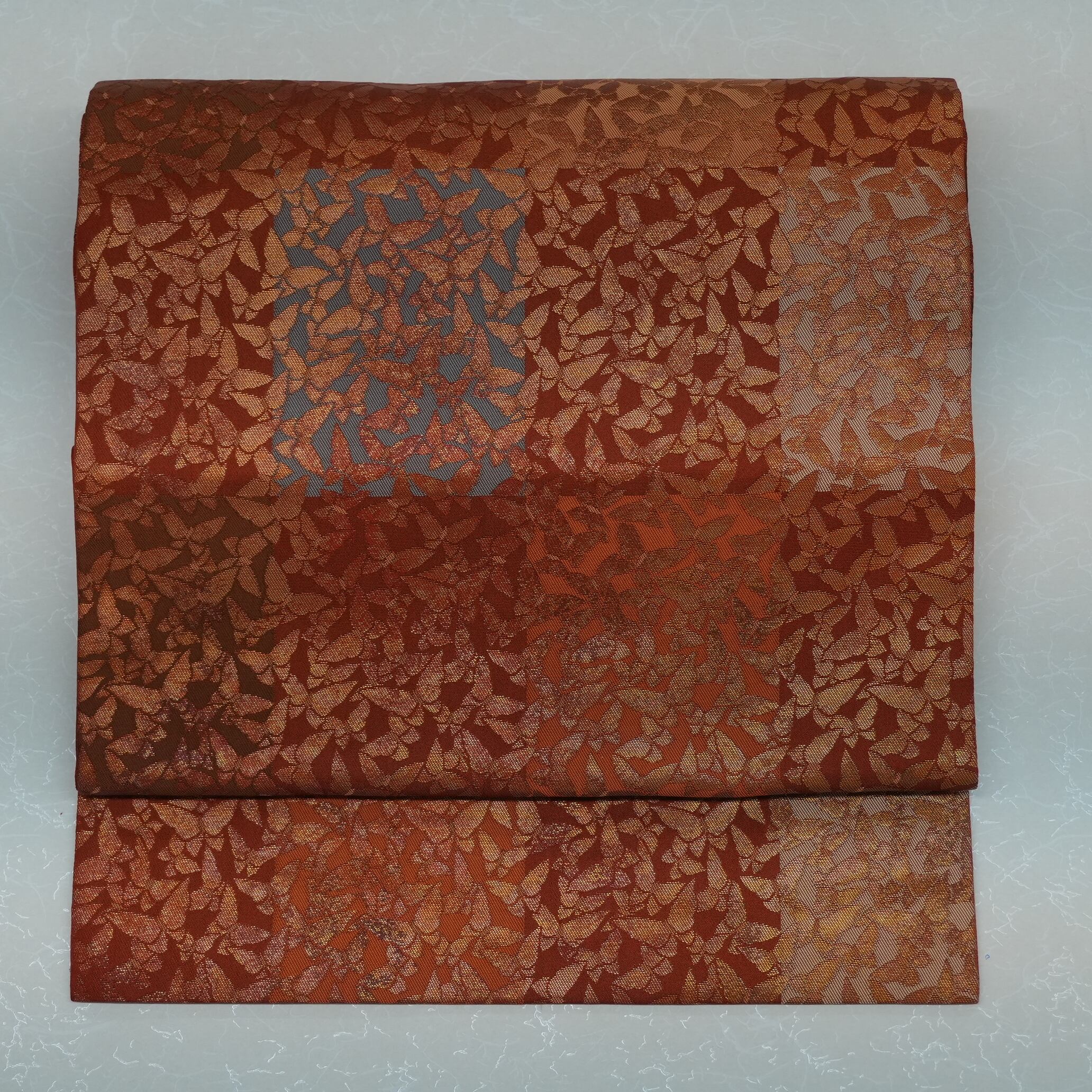 複数の色を巧みに使い分けた石畳の地色の上に金糸で表現された小さな蝶が舞う様子は、優雅さと華やかさを兼ね備えています。
