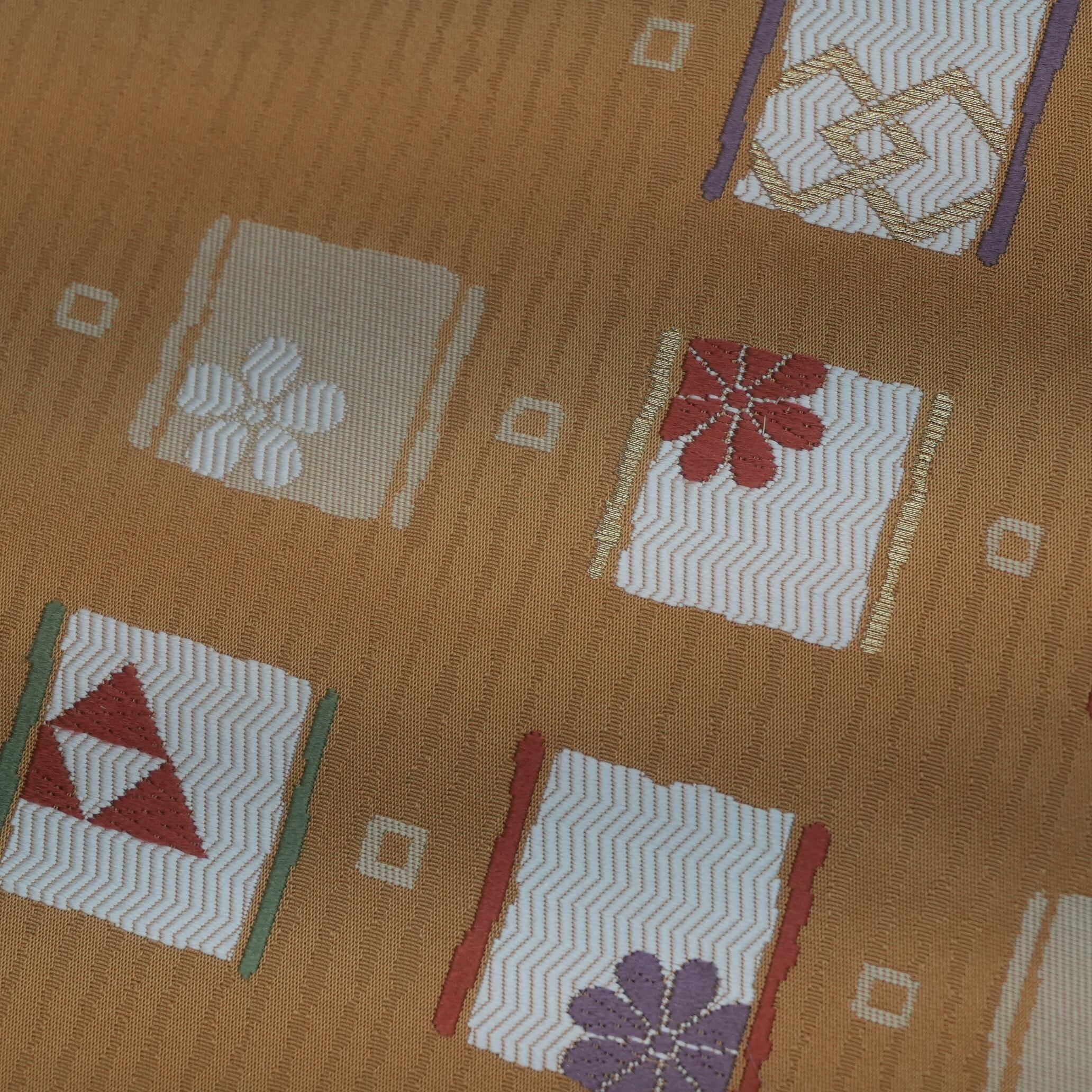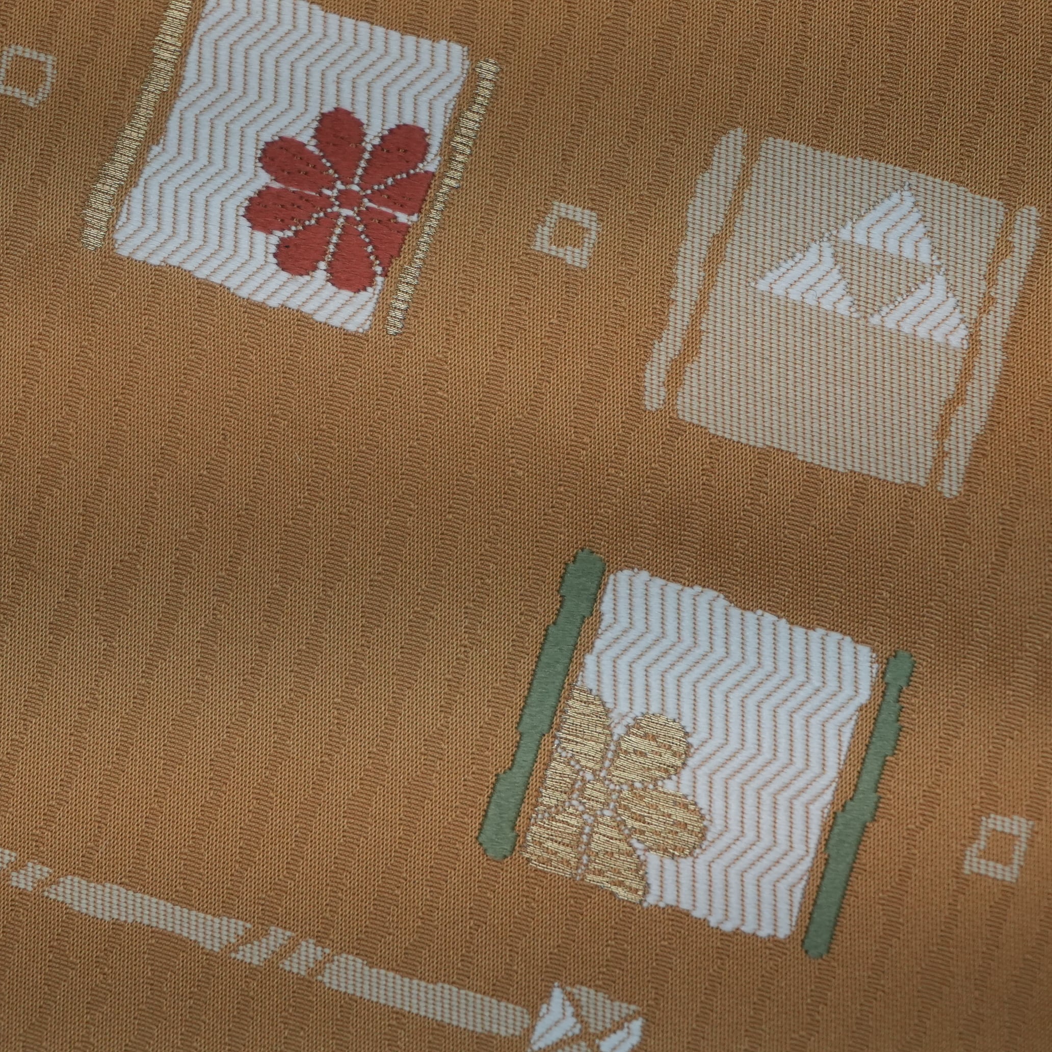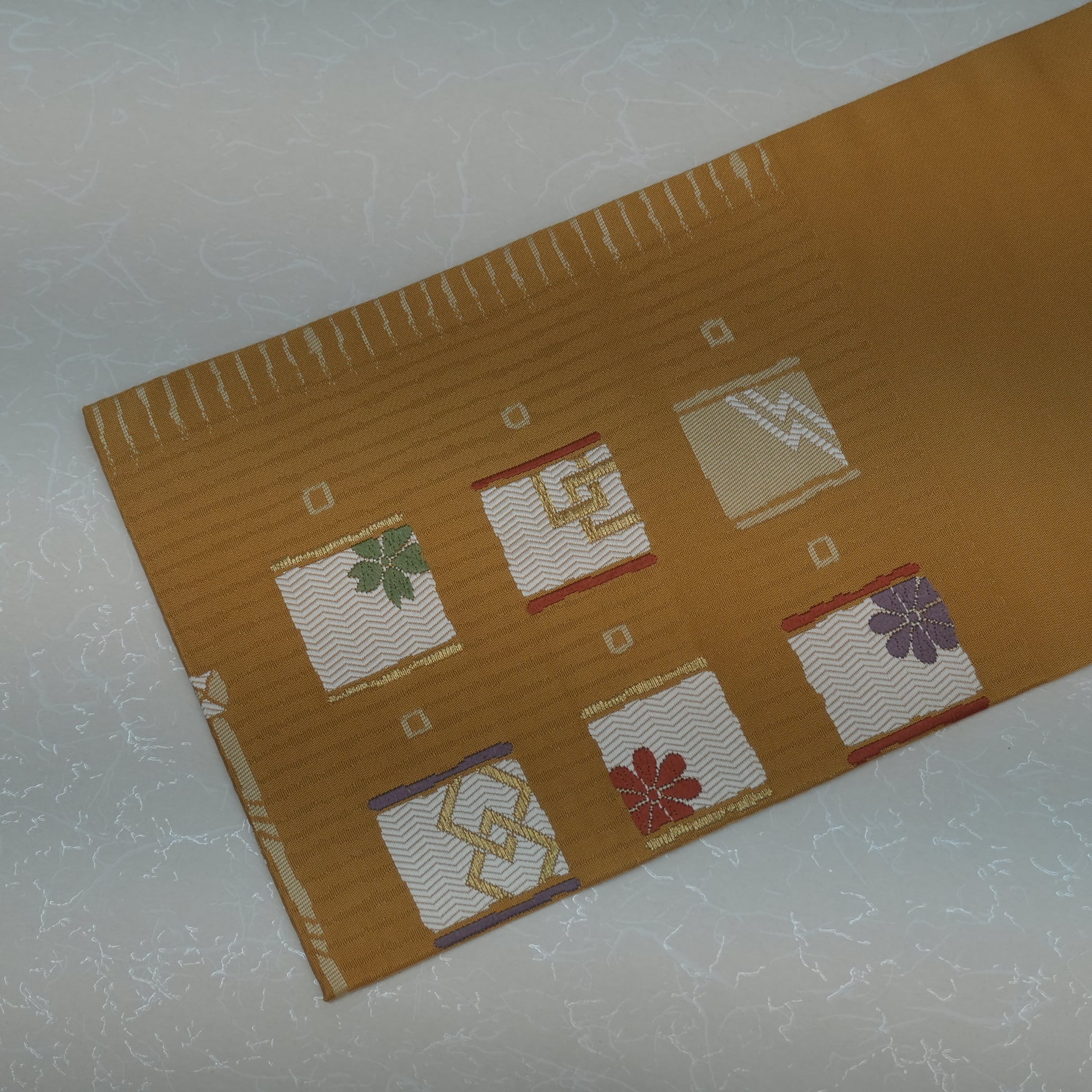 こちらの練習用お仕立て上がり名古屋帯は、明るい芥子色の地色にスクエア模様が並ぶ独自愛らしいデザインが特徴です。窓を思わせるこのスクエア模様の中には、菊の花、梅の花、桜の花、鱗模様、稲妻などがあしらわれています。名古屋帯ならではの楽しさを詰め込んだカジュアル専用の帯です。着物とのコーディネートを引き立て、着る人の魅力をより一層引き出します。