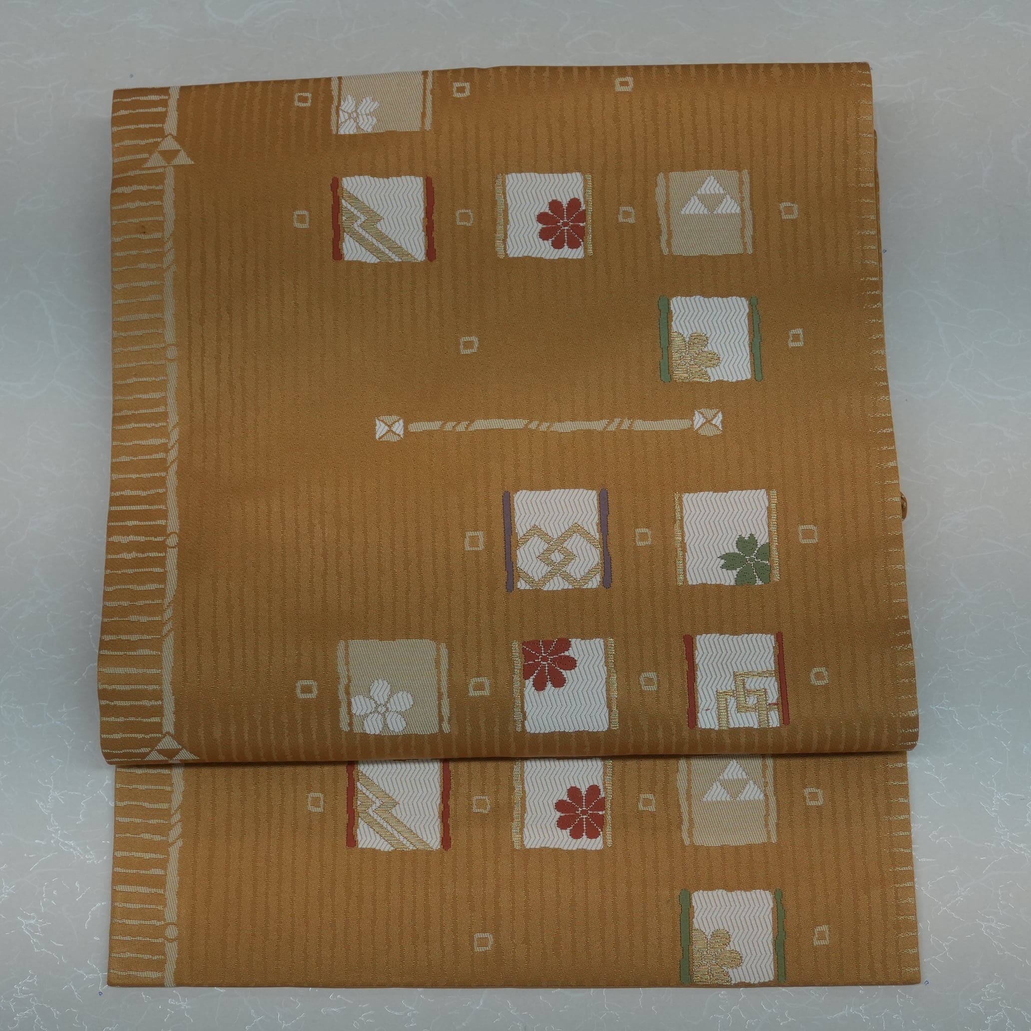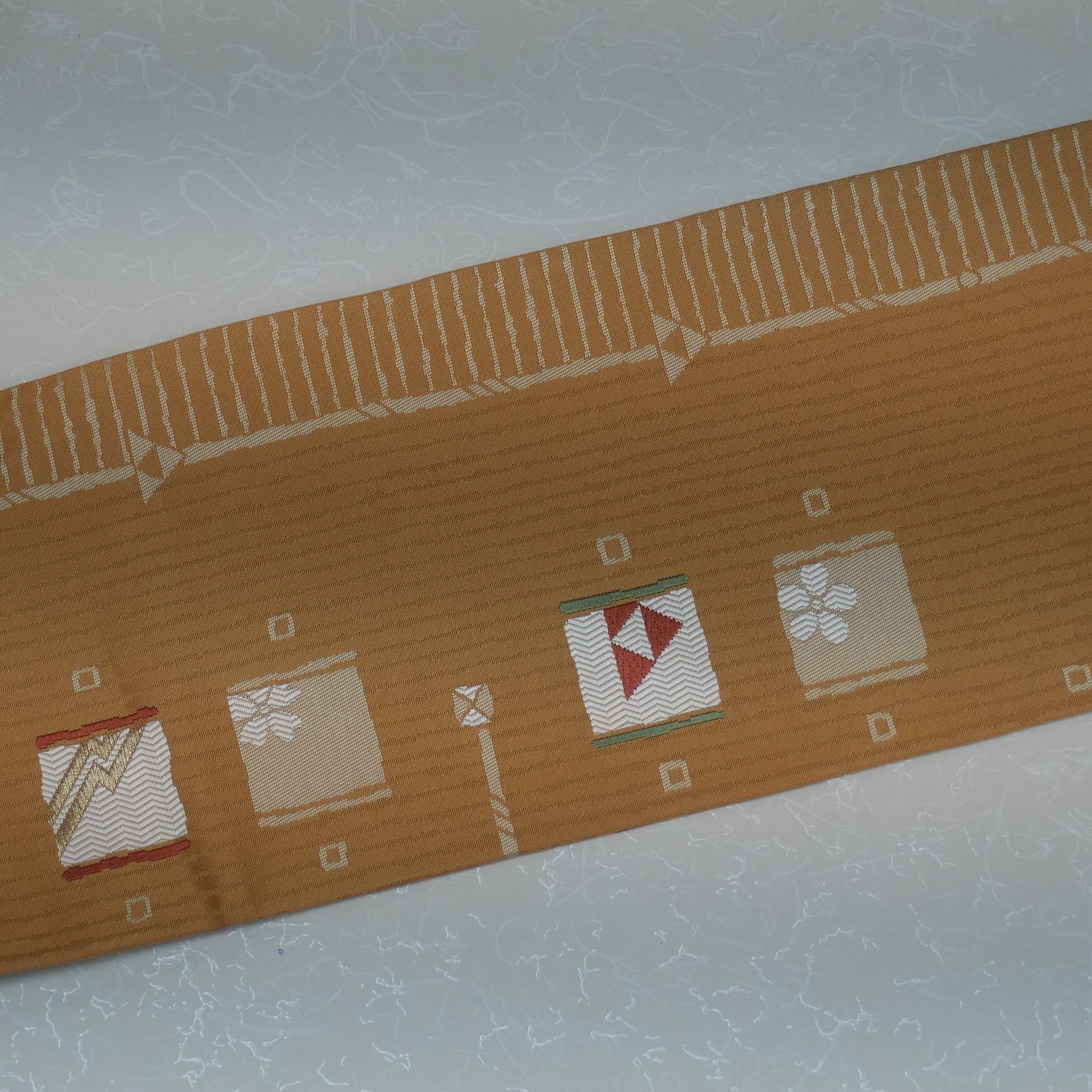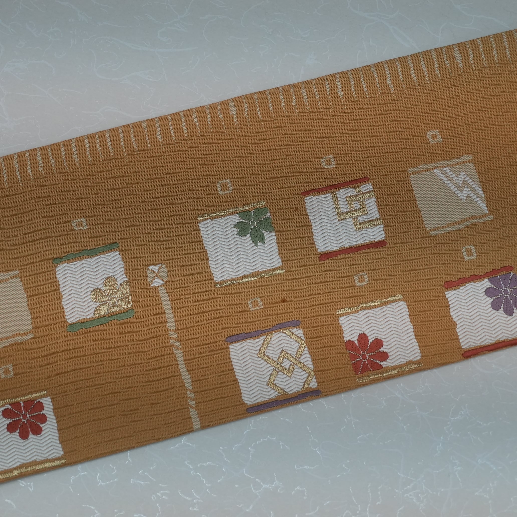 こちらの練習用お仕立て上がり名古屋帯は、明るい芥子色の地色にスクエア模様が並ぶ独自愛らしいデザインが特徴です。窓を思わせるこのスクエア模様の中には、菊の花、梅の花、桜の花、鱗模様、稲妻などがあしらわれています。名古屋帯ならではの楽しさを詰め込んだカジュアル専用の帯です。着物とのコーディネートを引き立て、着る人の魅力をより一層引き出します。