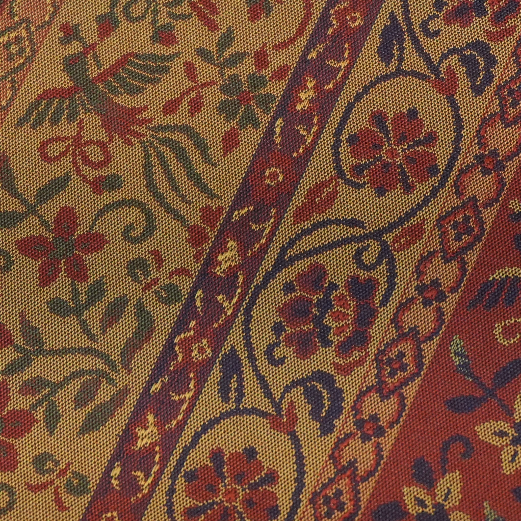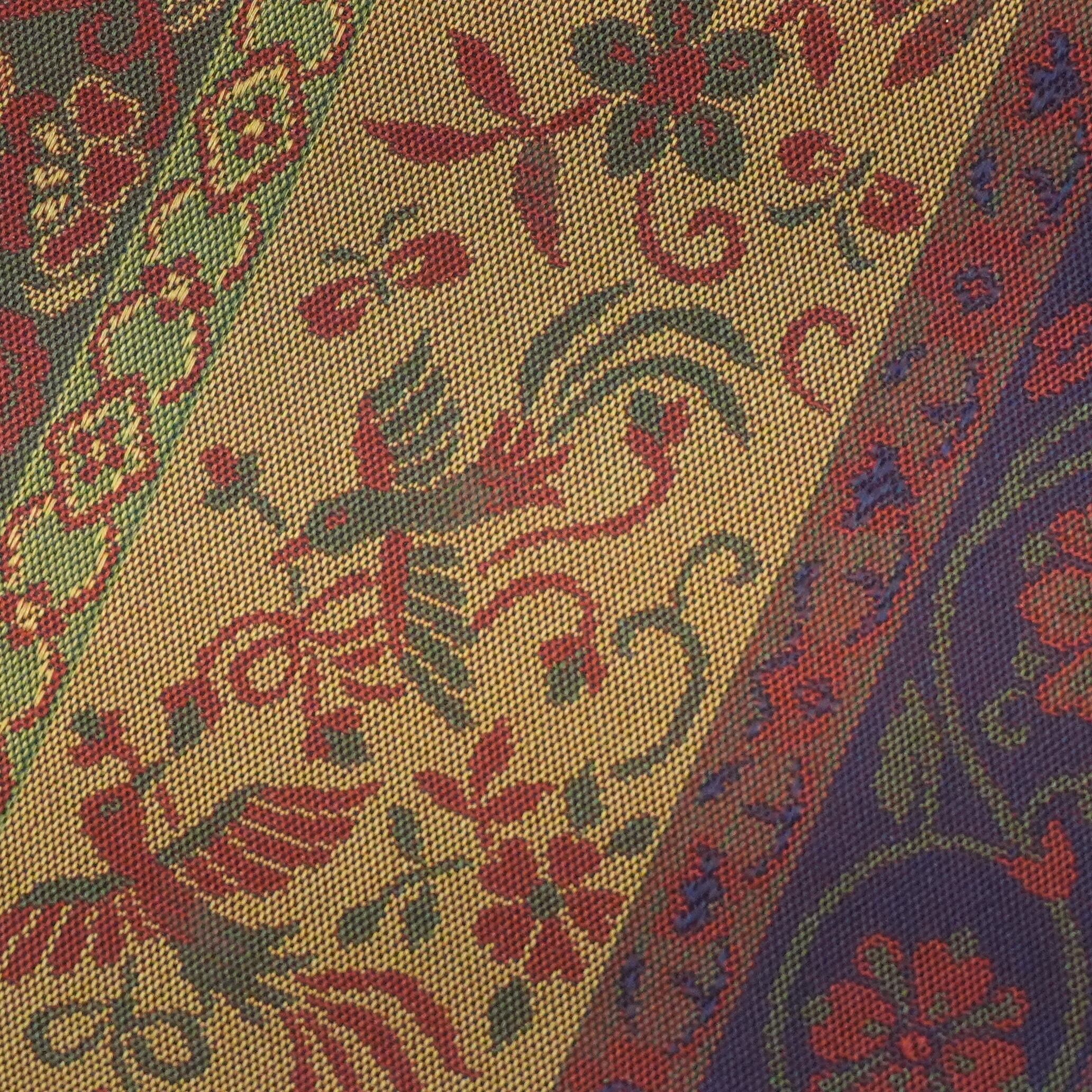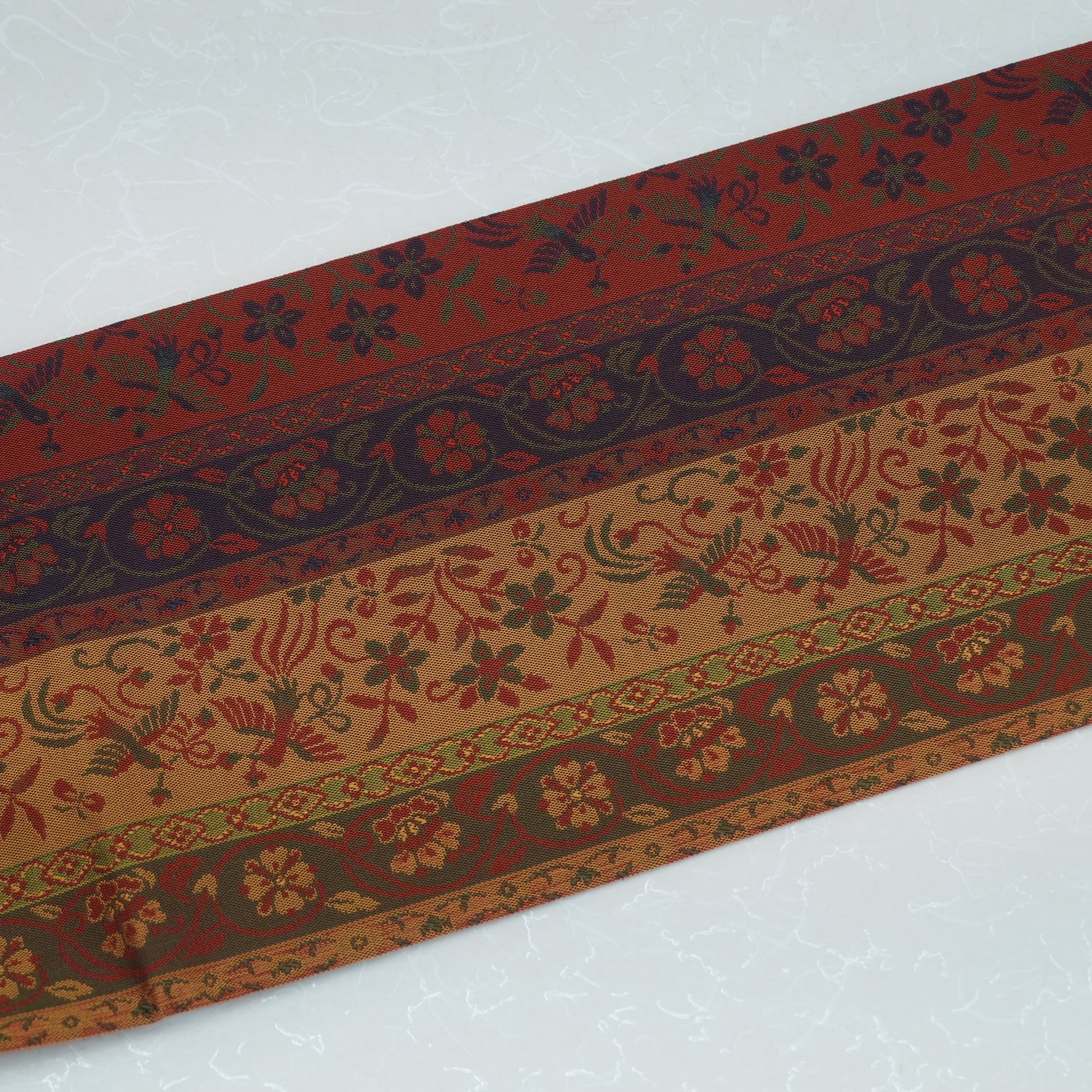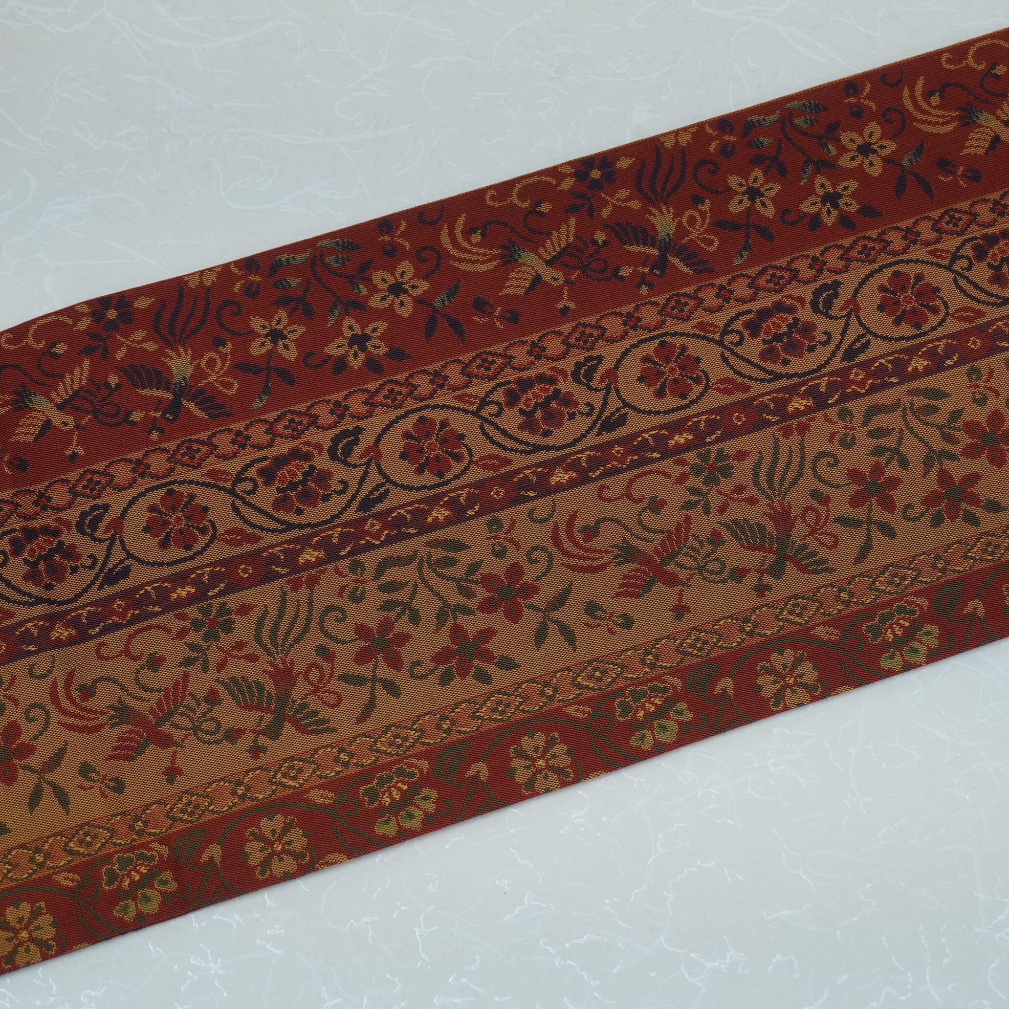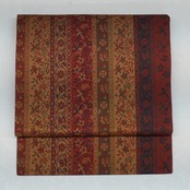 全長363㎝全てに柄が織り出されているので、どこに枕を置いてもイメージが異なることなくお太鼓が作れます。紋様は表現の異なる花喰い鳥と唐花がスッキリと縦に配置され芥子色、朱色、抹茶色、群青色など日本の古典色がバランス良く様々なきものに調和してくれると思います。