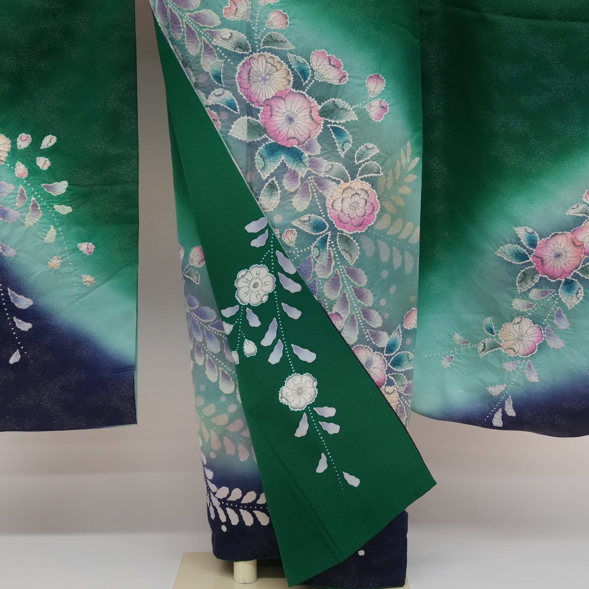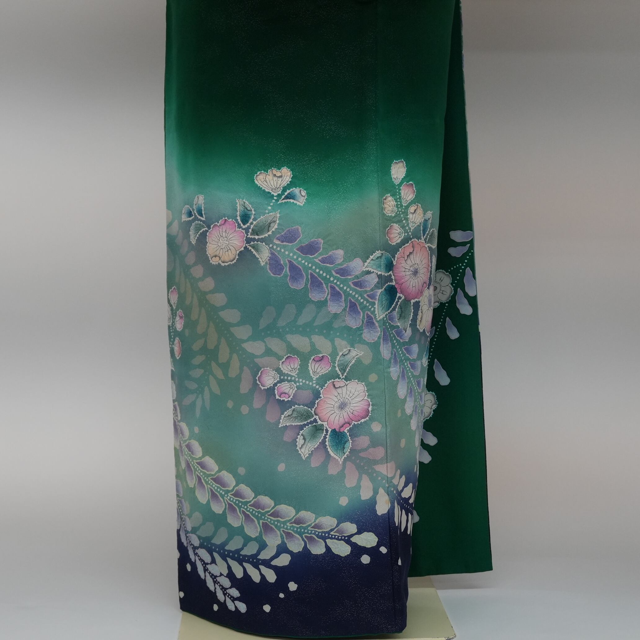 文様の部分には絞りが施され、立体感を生み出し、裾に向かうほど濃紺になるぼかしが調和をもたらしています。