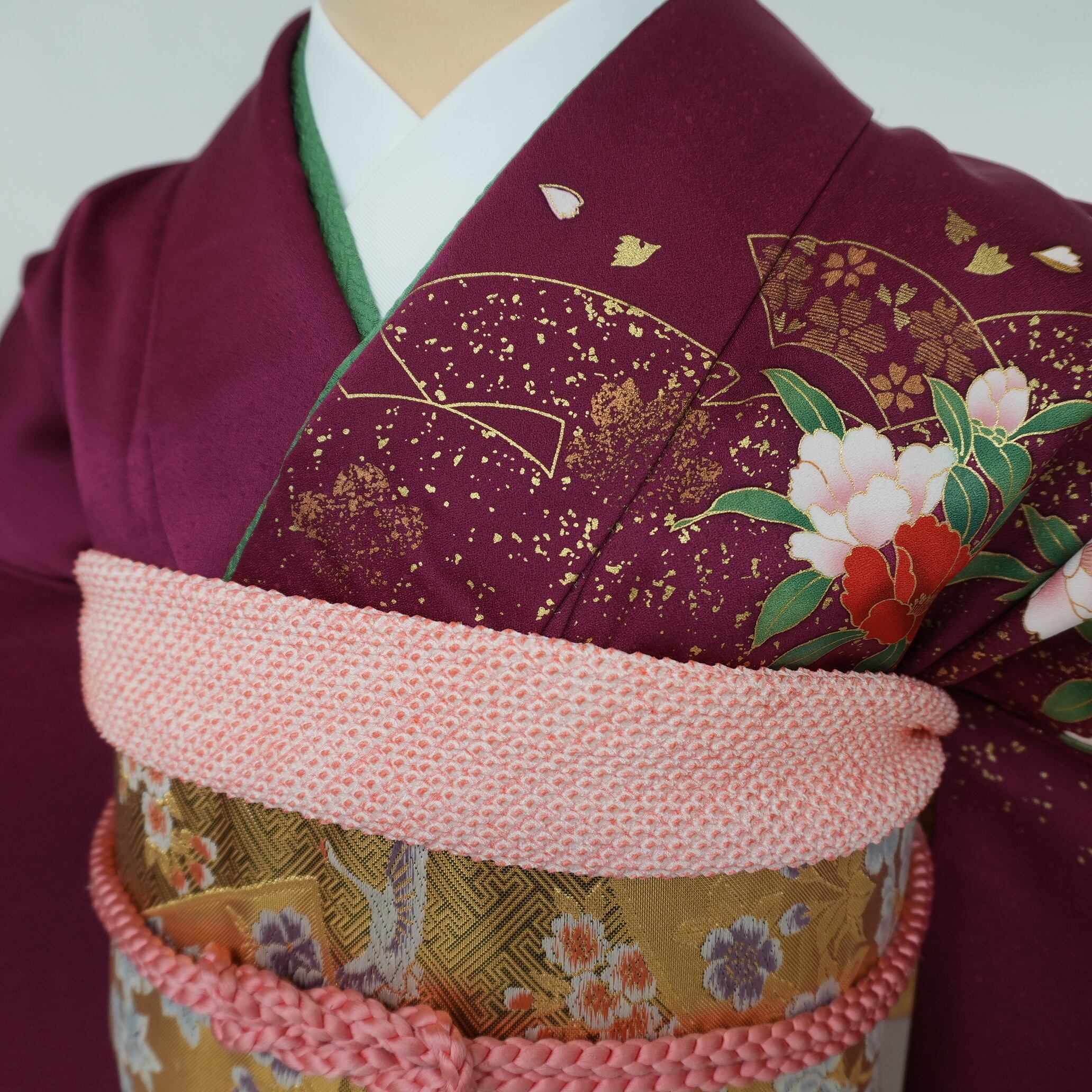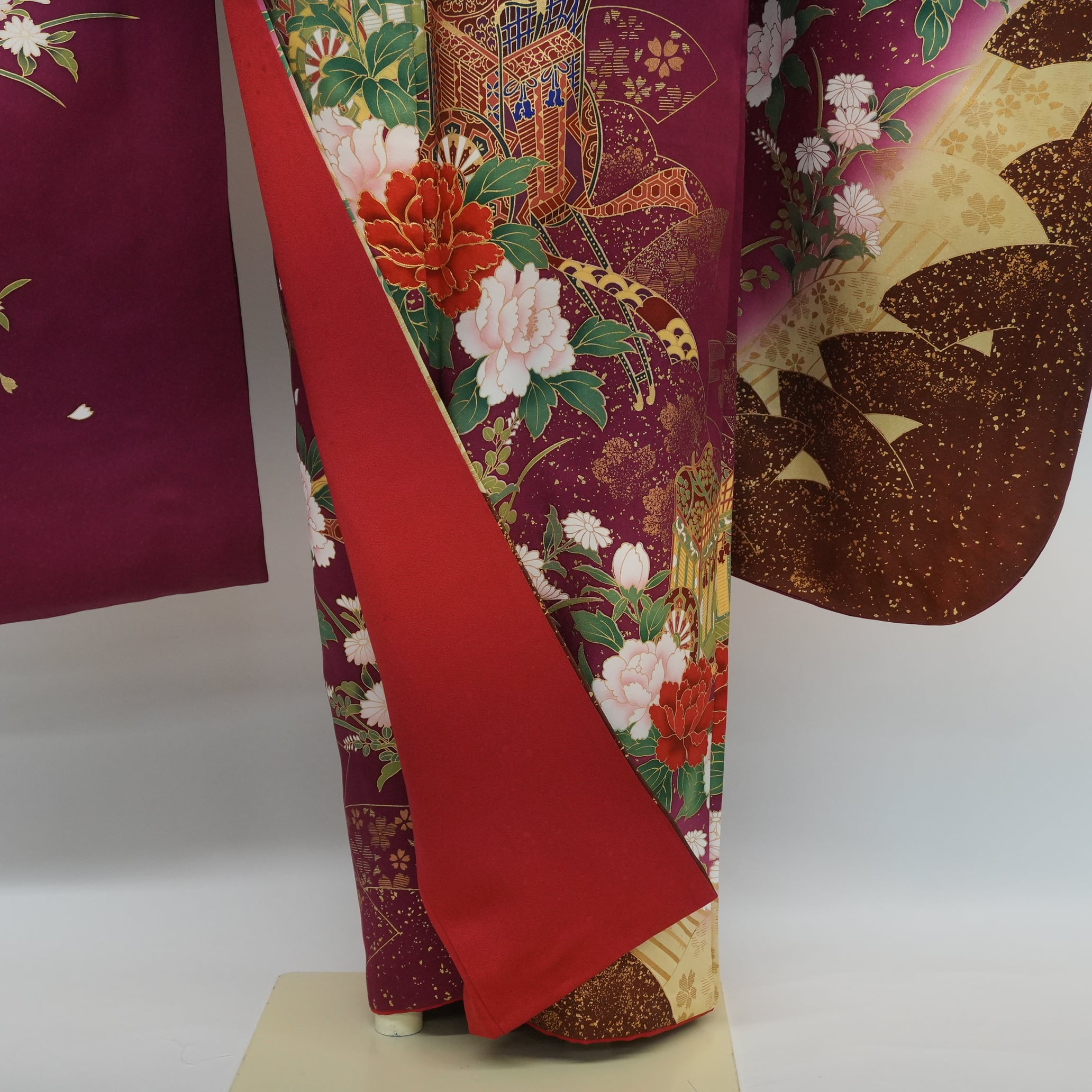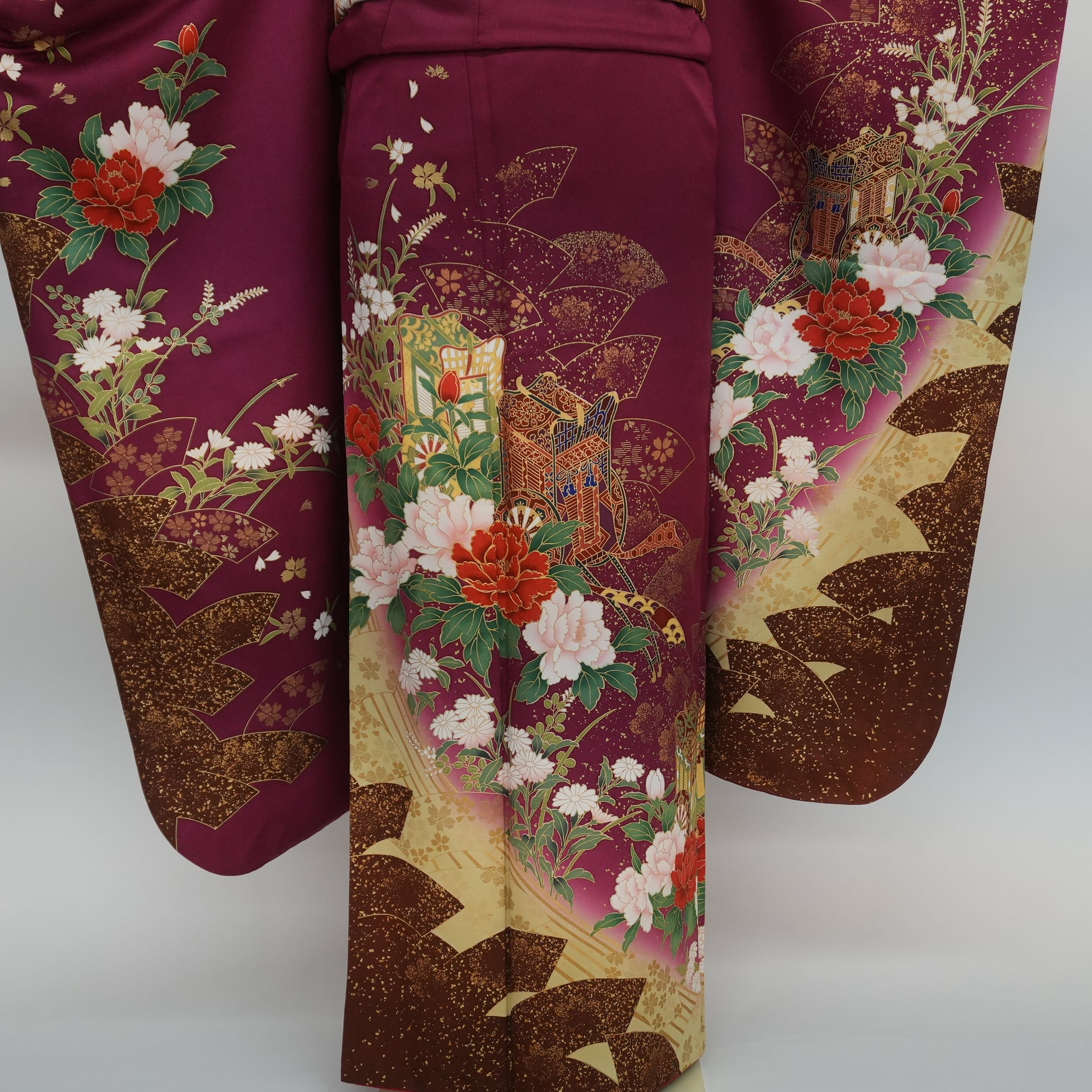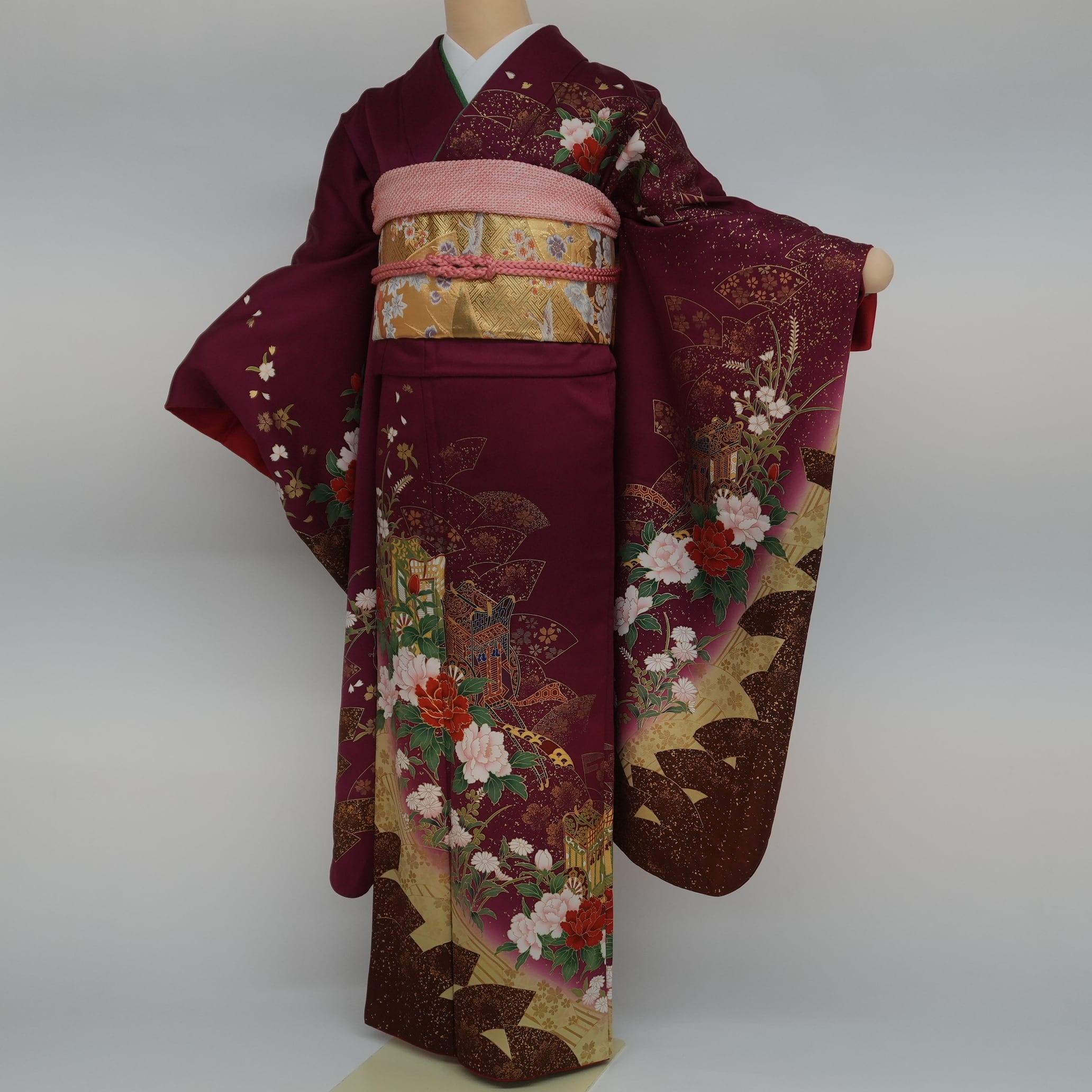 こちらの練習用振袖セットは、深みのあるボルドーの地色が華やかな印象を与える振袖です。で構成している文様は全て古典的ながらも個性的な扇面のシルエットを裾に配置し、御所車、草花紋様などが調和しています。