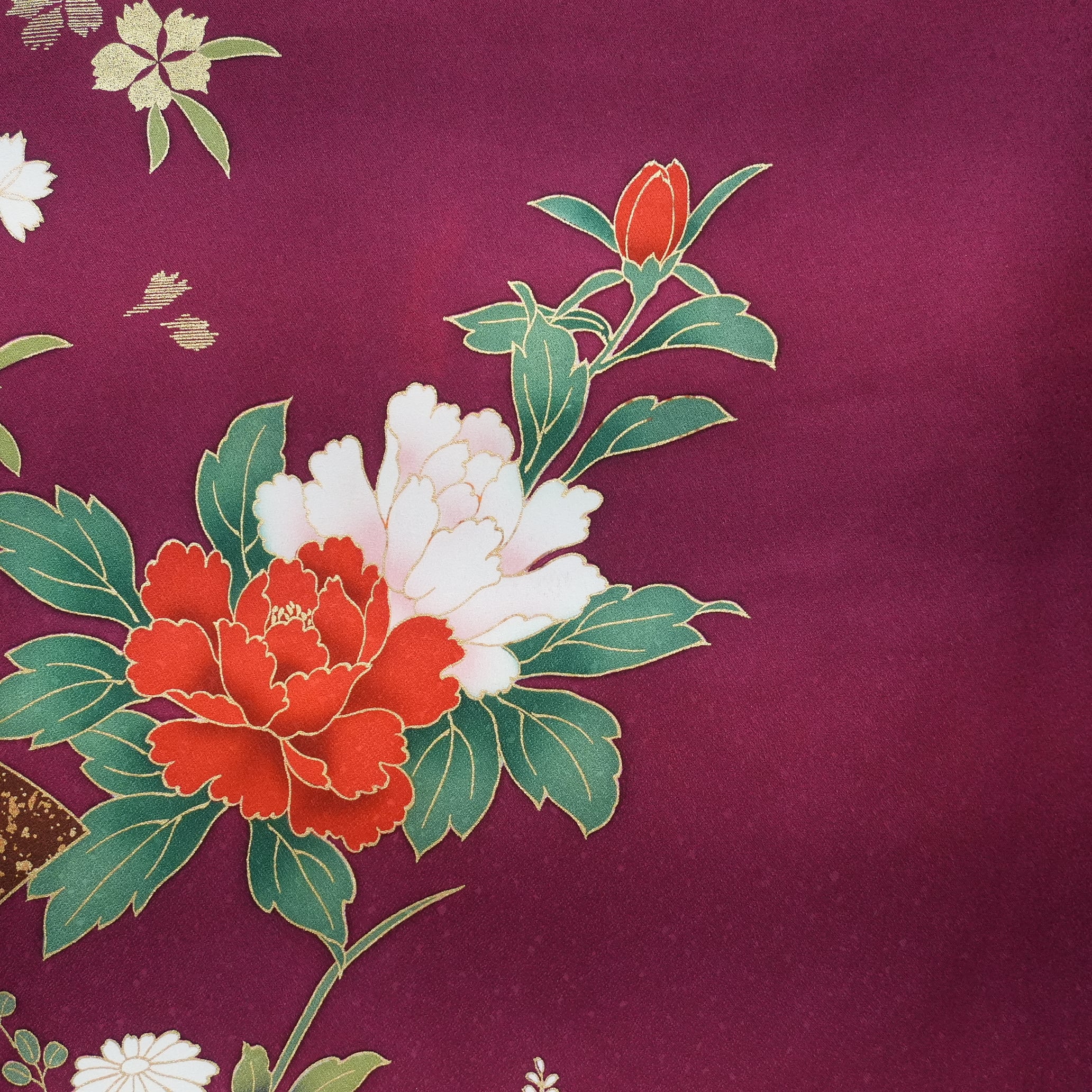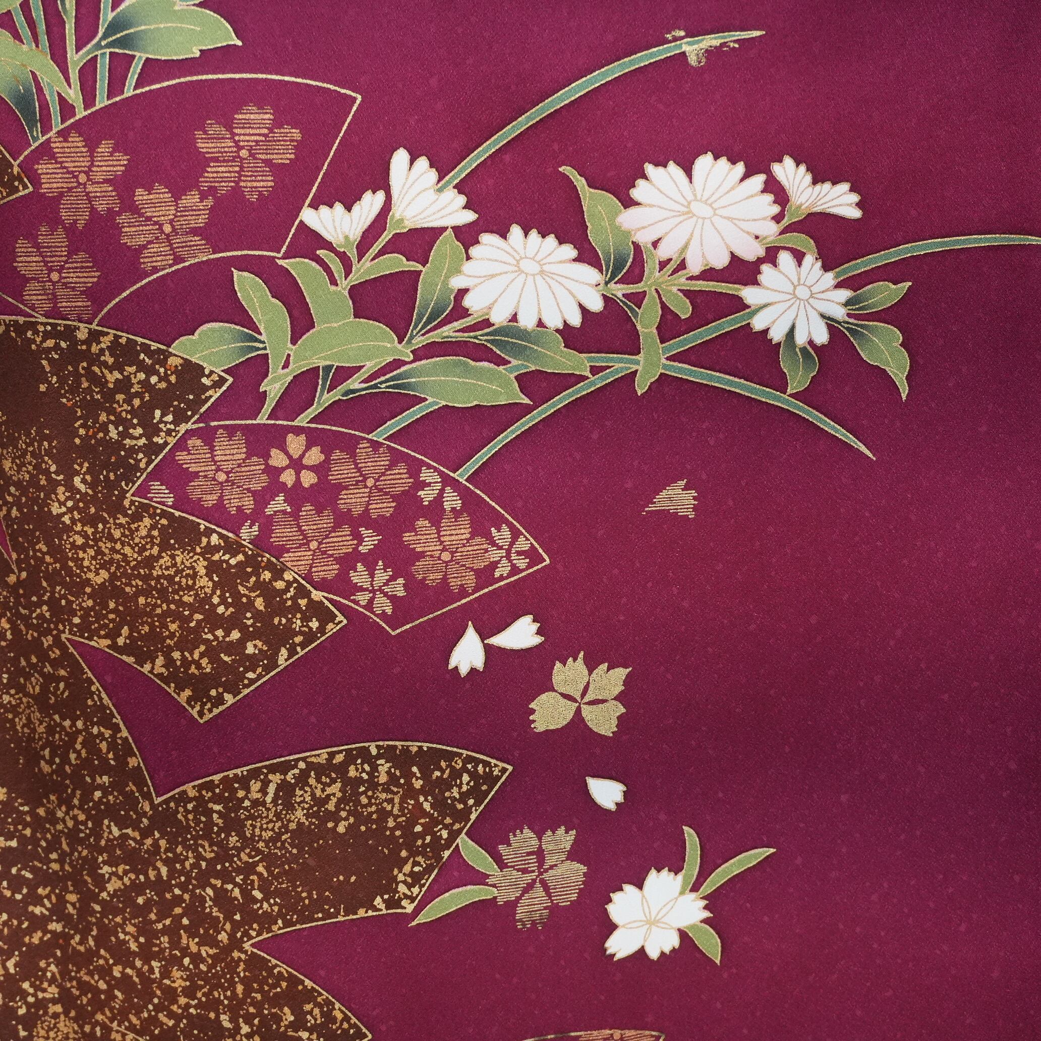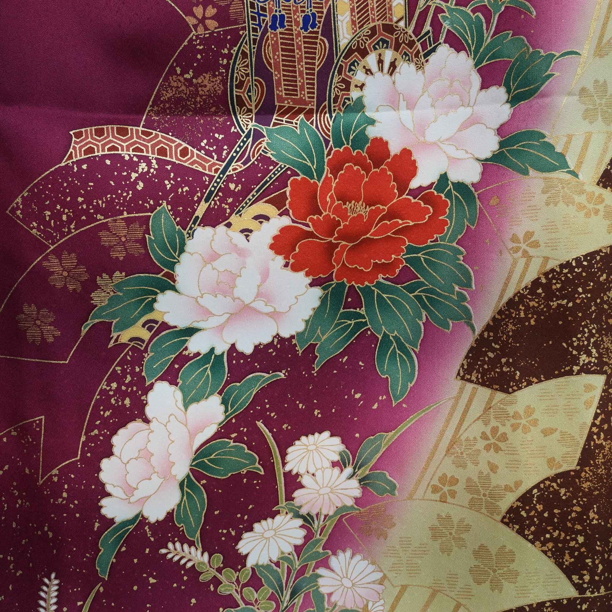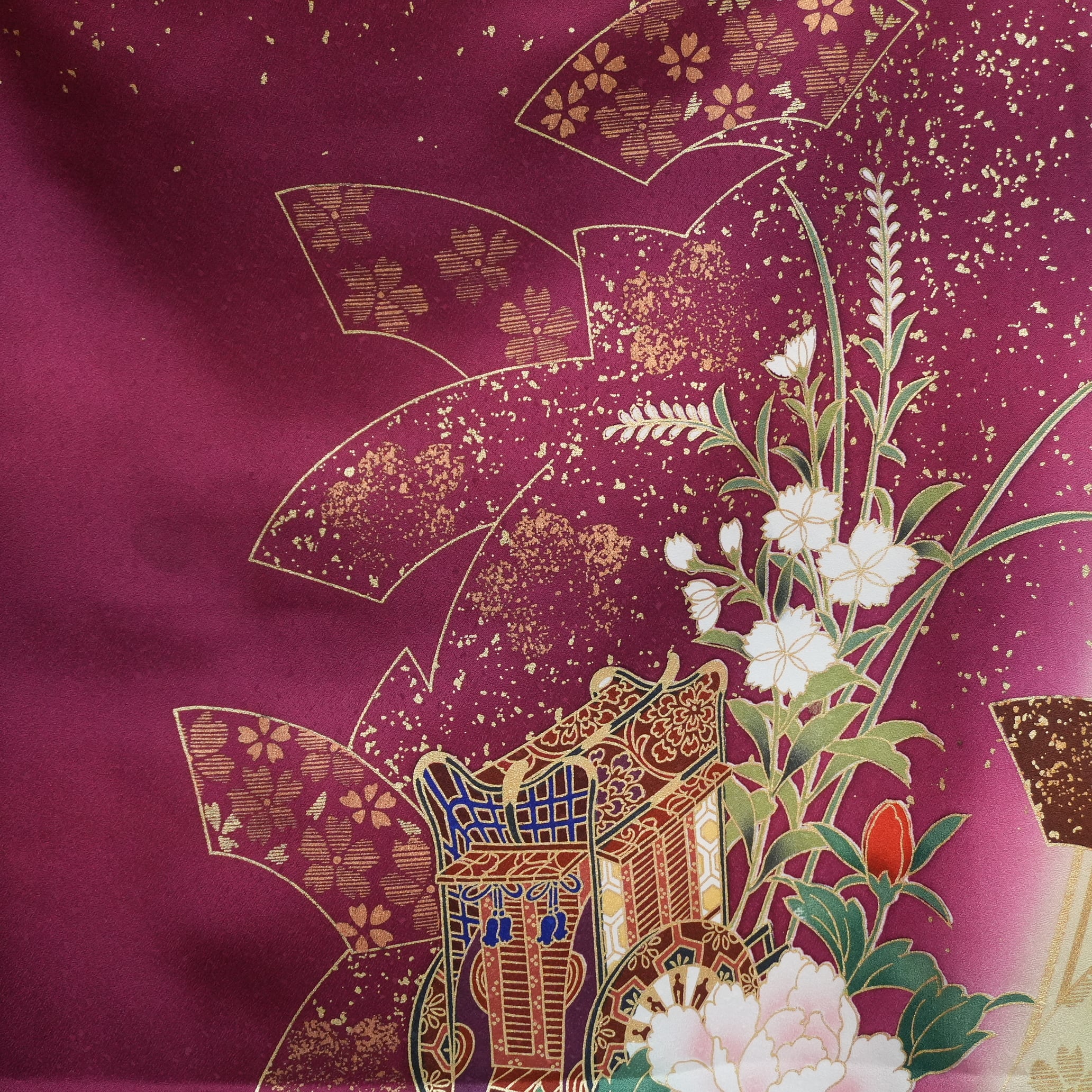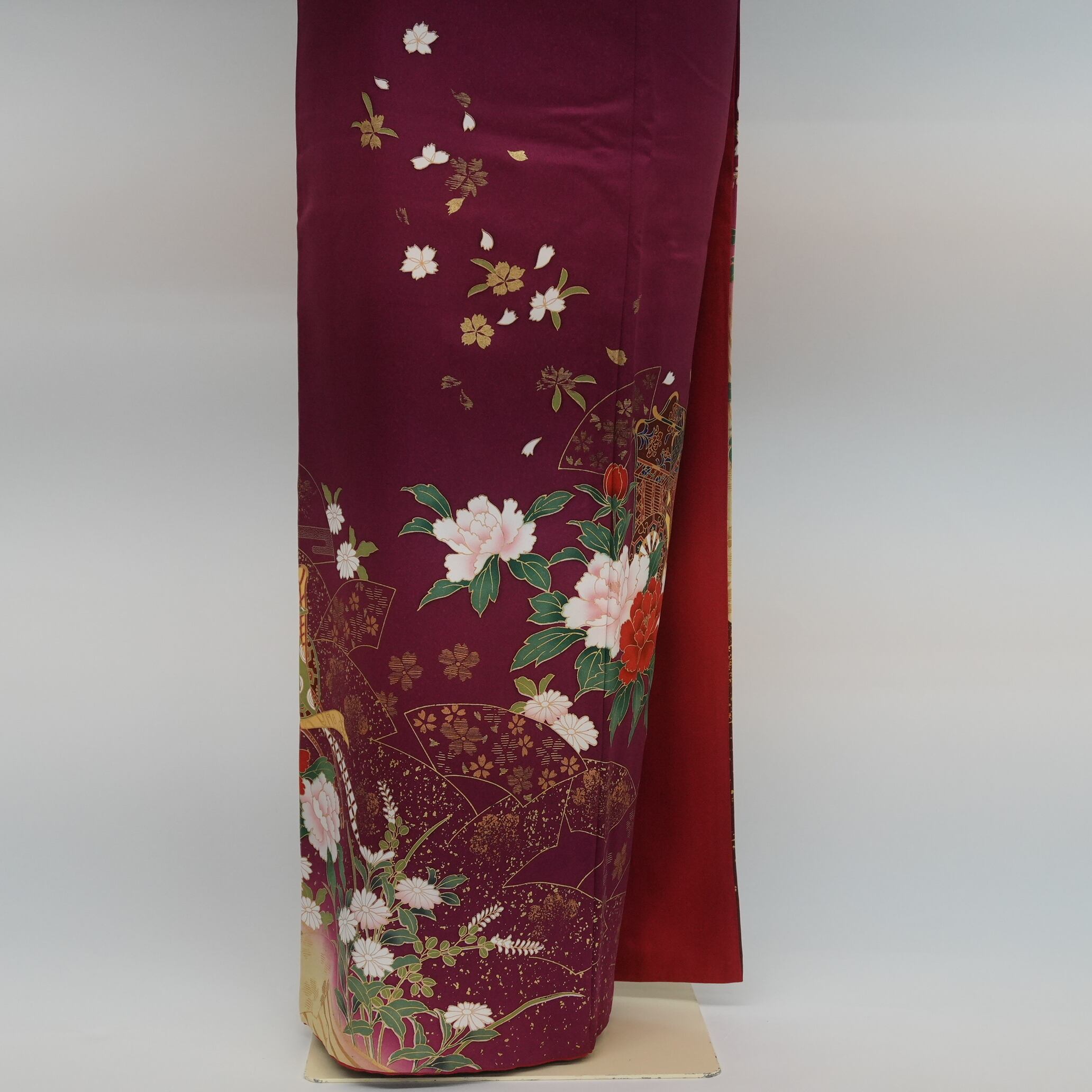 こちらの練習用振袖セットは、深みのあるボルドーの地色が華やかな印象を与える振袖です。で構成している文様は全て古典的ながらも個性的な扇面のシルエットを裾に配置し、御所車、草花紋様などが調和しています。