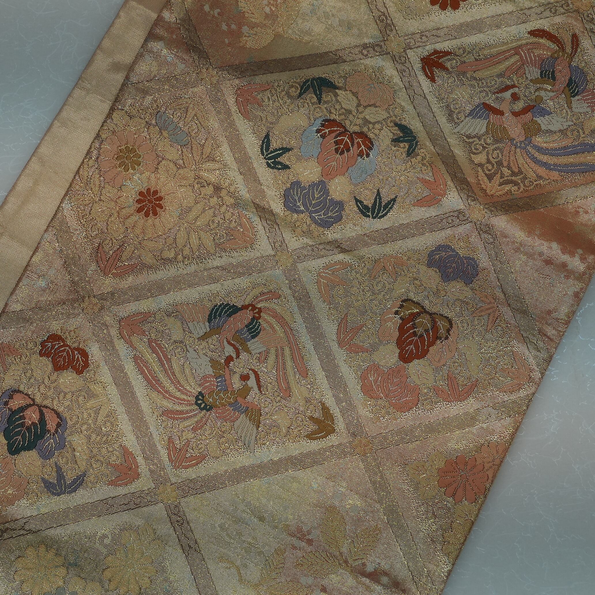 格子の中には、唐草に菊花、鳳凰に笹、桐に笹などが組み合わされ落ち着きのある金箔の上に織り出され格調高い印象を与えています。