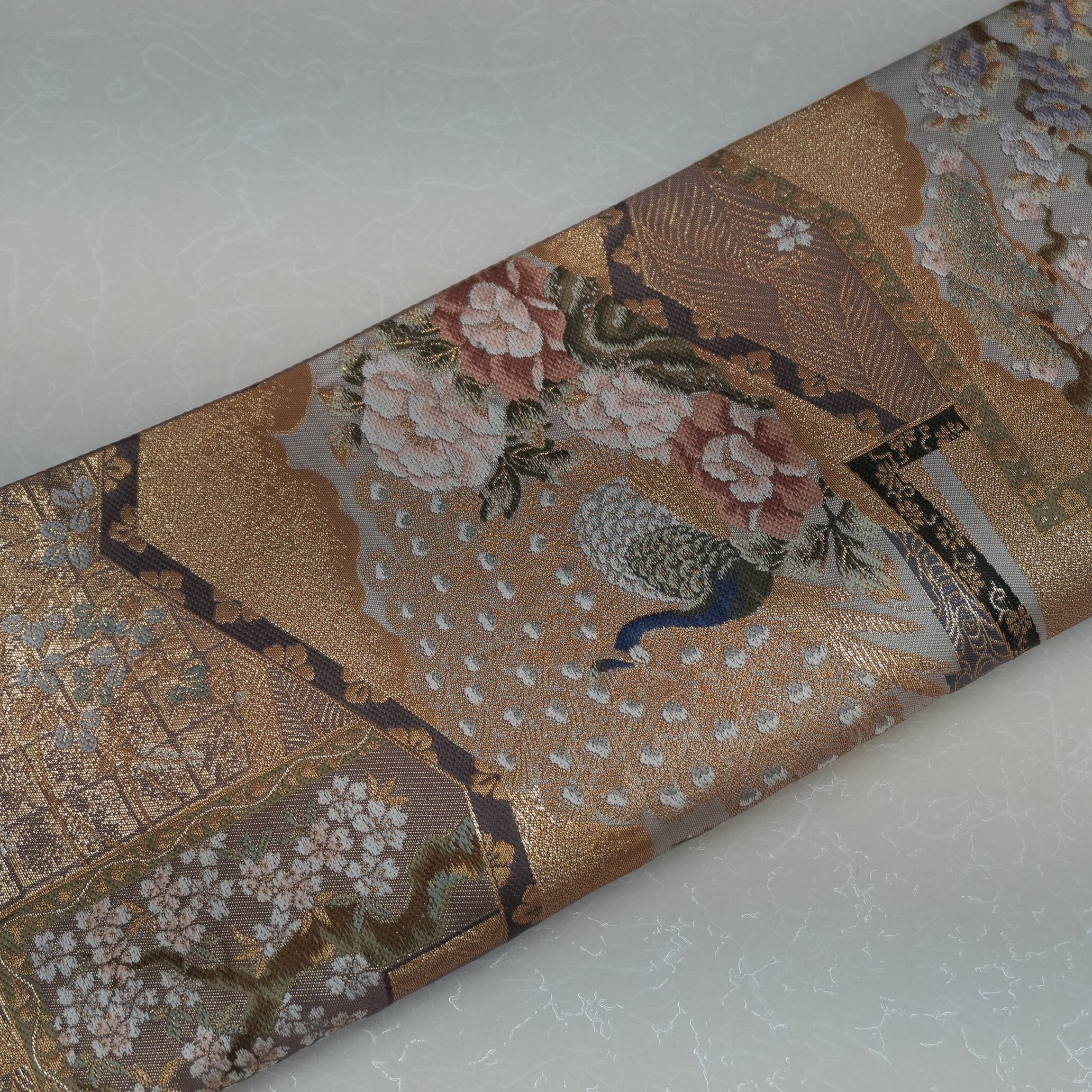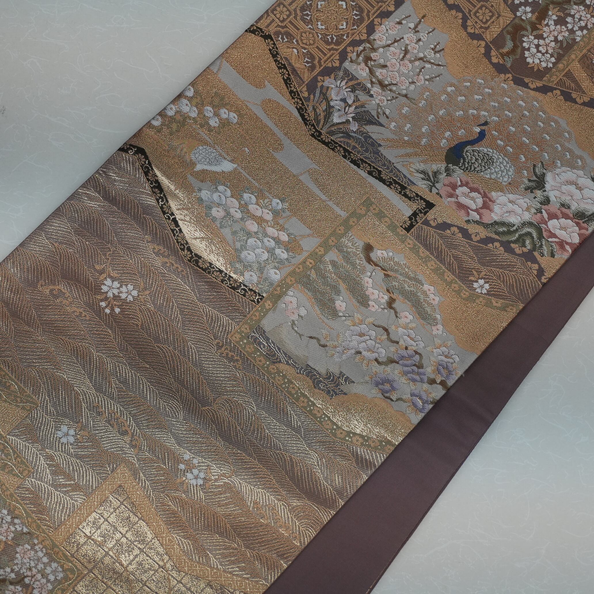 大きく羽根を広げた孔雀を中心に、繊細に表現された草花の美しいデザインが映える一品です。落ち着きのある配色の引き箔が、上品でありながらも華やかさを演出し、着る人の魅力を引き立てます。