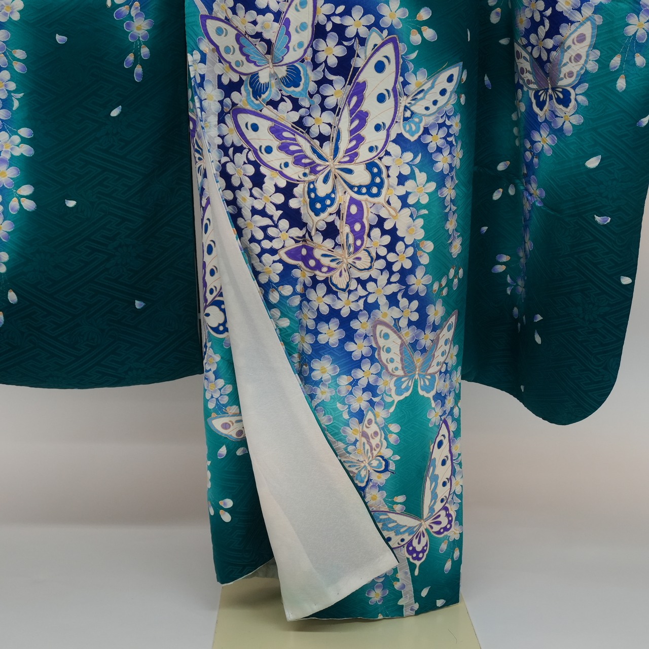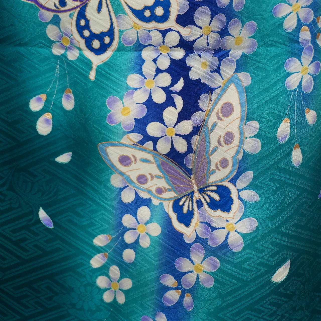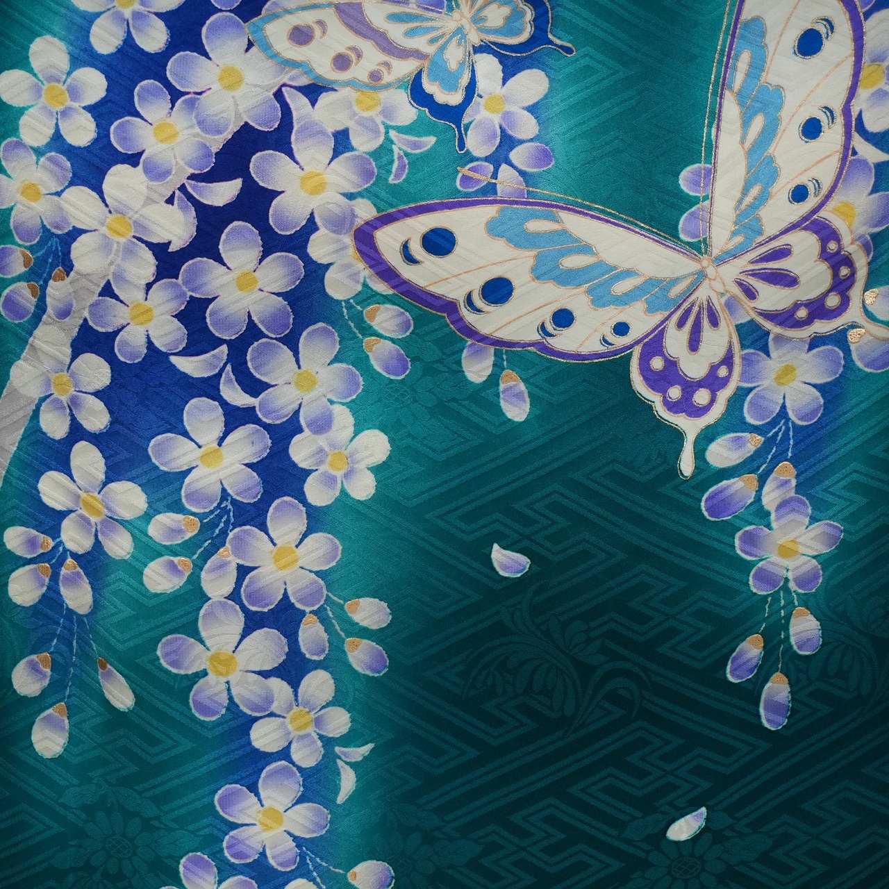 緑の地色に、白と紺で描かれた蝶が華やかに舞い、小花がぼかしの中でたくさん表現され奥行き感を醸し出しています。