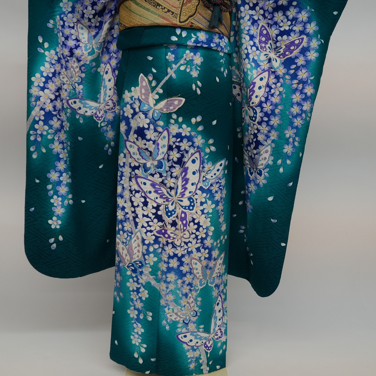 振袖に表現されいる蝶と同じイメージの柄が織り出された袋帯を合わせ、統一感のある印象を与え他にはない特別な存在感を放っています。