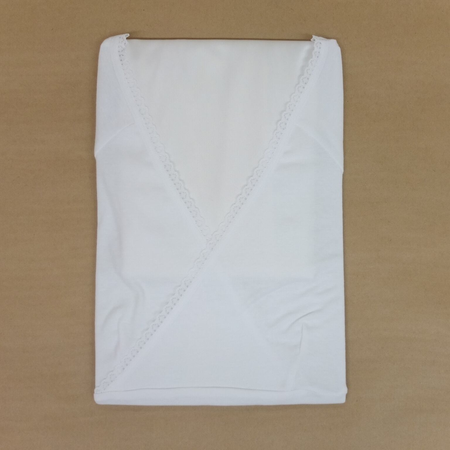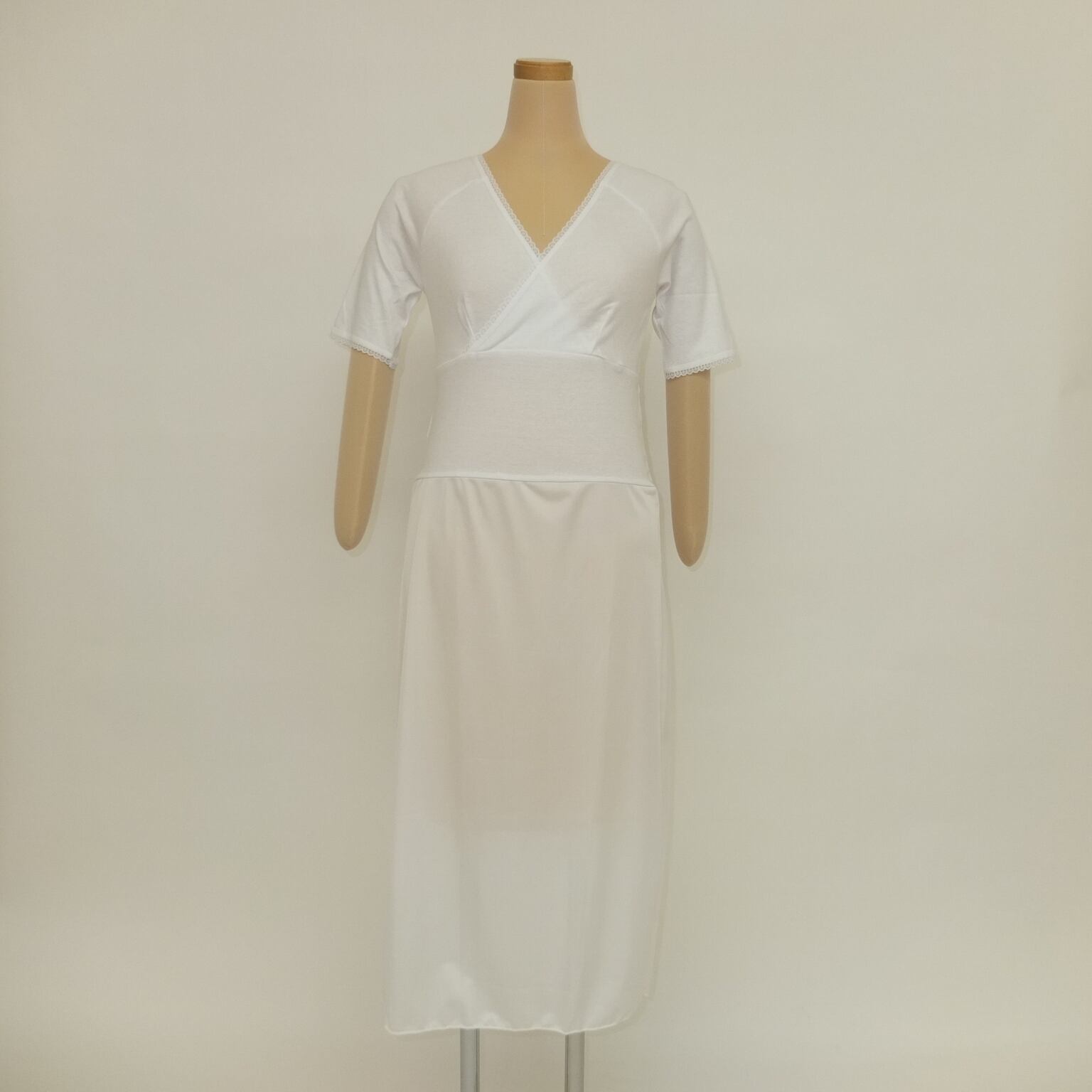 身頃はお肌に優しく吸湿性に優れた上質な綿糸を100%使用し、裾部分はすべりの良い東レシルックを使用しています。静電気防止加工が施されている上に両サイドにスリットが入っているため裾さばきがしやすい仕上げになっています。